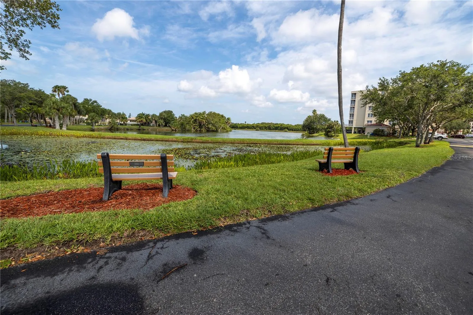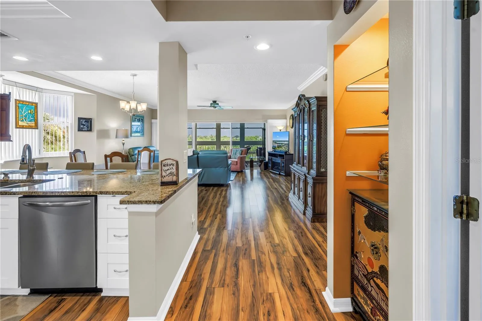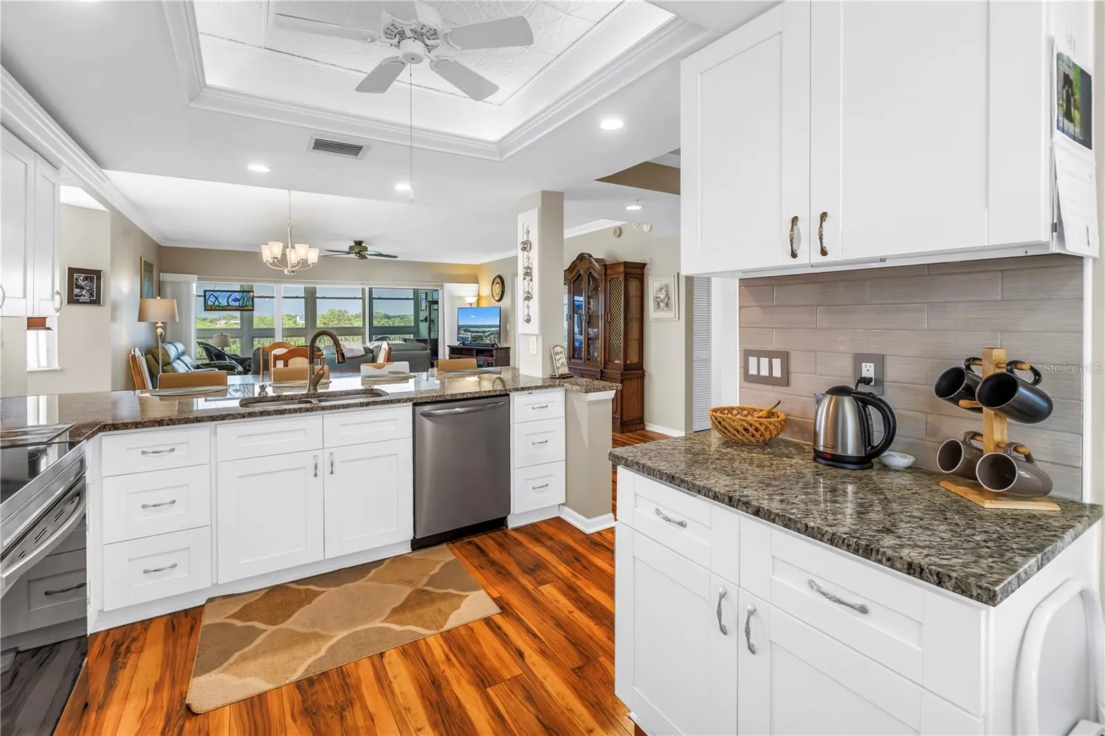 YOUR FLORIDA DREAM COMES TRUE – COMPLETELY REMODELED WATERFRONT CONDO – WATERVIEWS FROM EVERY WINDOW! This 3 bedroom, 2 bath, PRIVATE 1 ½ CAR GARAGE rarely available in the highly desired community of Shores of Long Bayou. The kitchen is a chef’s dream, completely updated with granite countertops, hardwood soft-close cabinets, a custom, deep pantry with pull out shelves, stainless appliances, tray ceilings with recessed can lights, and breakfast bar. Chef’s kitchen has room for an eat-in breakfast nook that overlooks the water and there is also a separate dining room. LIGHT AND BRIGHT – this open floorplan has plenty of space to entertain with the large living room and sunroom, both featuring sweeping views of the waterfront bayou. The split bedroom floorplan allows for privacy in all areas of this home. Primary bedroom features an en-suite bath, complete with his and her walk-in closets, dual vanities, quartz counters, hardwood cabinets, top of the line walk-in tiled shower with teak fold away bench and upgraded recessed light fixtures. Extra-large primary bedroom will accommodate a large King-sized furniture set. Second bath is complete with a tub shower combo. Pride of ownership is clear here in both this unit and the community. No detail has been missed – Updated Impact rated windows, New Roof (2024), Newer AC (2018), New Water Heater (2019), new flooring and crown moulding throughout, refrigerator with double ice maker, and whole house water filter system. Private utility room inside your unit makes doing laundry a breeze. Oversized 1 ½ car garage boasts high ceilings able to accommodate extra storage , complete with a pedestrian door and hurricane rated garage door. Plenty of space for a car AND a golf cart. Air-conditioned storage room and garage provide plenty of room for your car or toys, this home has it all. Water views of the expansive bayou. This End Unit means that you have a large front patio overlooking the lake, great covered area for outdoor entertaining, as well as the sunroom overlooking the bayou – WATERVIEWS ON BOTH SIDES! Quiet neighborhood has a 24 hour gated access with guard, secure door to the building lobby entrance and enclosed elevator entry. All of this luxury and security in a park-like setting. Community features includes a 77 acre nature preserve with heated pool, spa, grill, clubhouse with fitness center. Low monthly condo fees include cable, internet, sewer, water, trash and in-unit bi-monthly pest control – SAVES YOU MONEY $$!! Close to restaurants, shopping and award winning beaches.