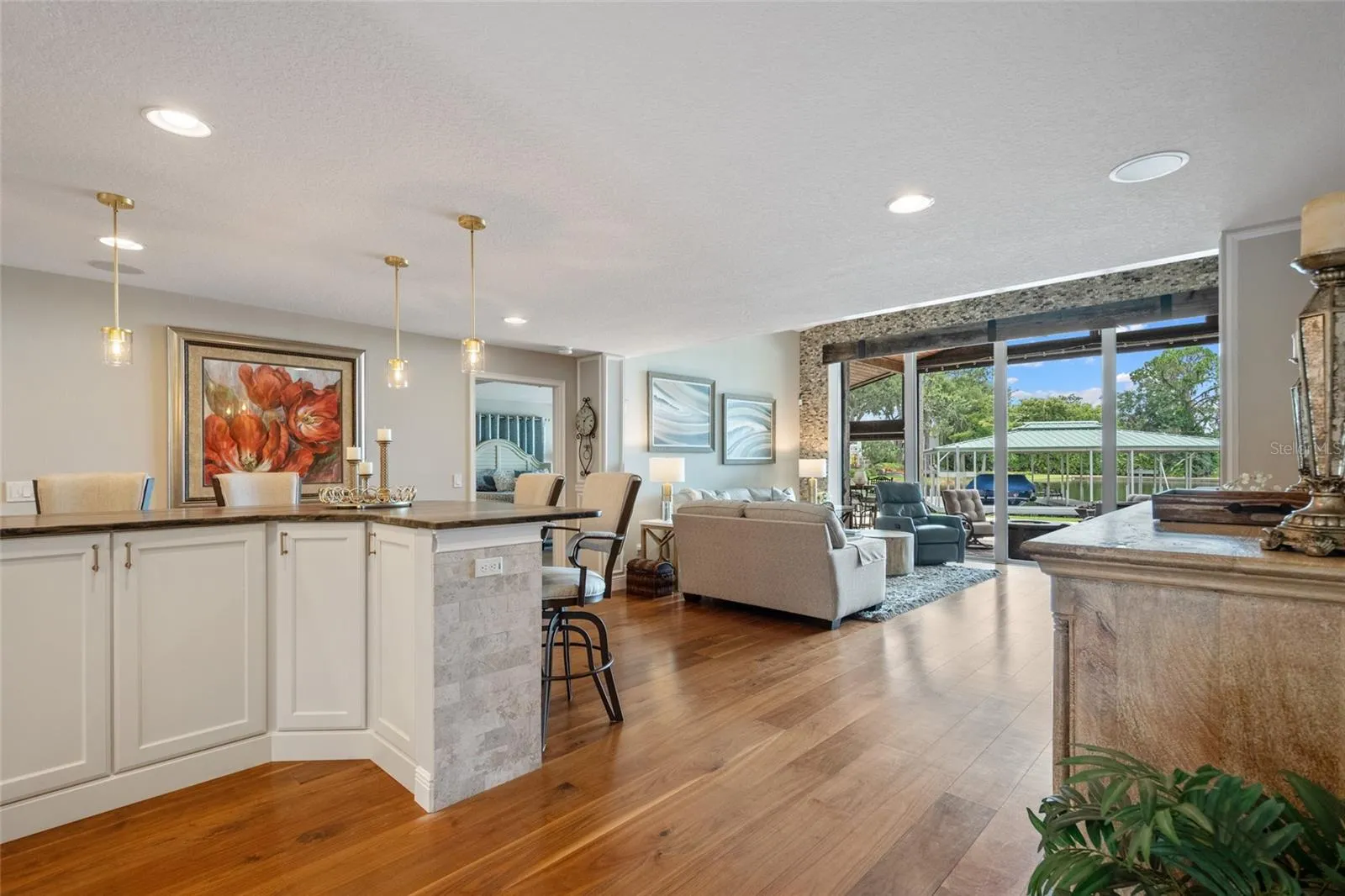 Step outside to the expansive back patio and pool area, designed for entertaining and relaxing alike. A summer kitchen, wood-burning fireplace, and retractable screens create an inviting space to enjoy year-round, while the sparkling pool and seawall add to the home’s functionality and charm.