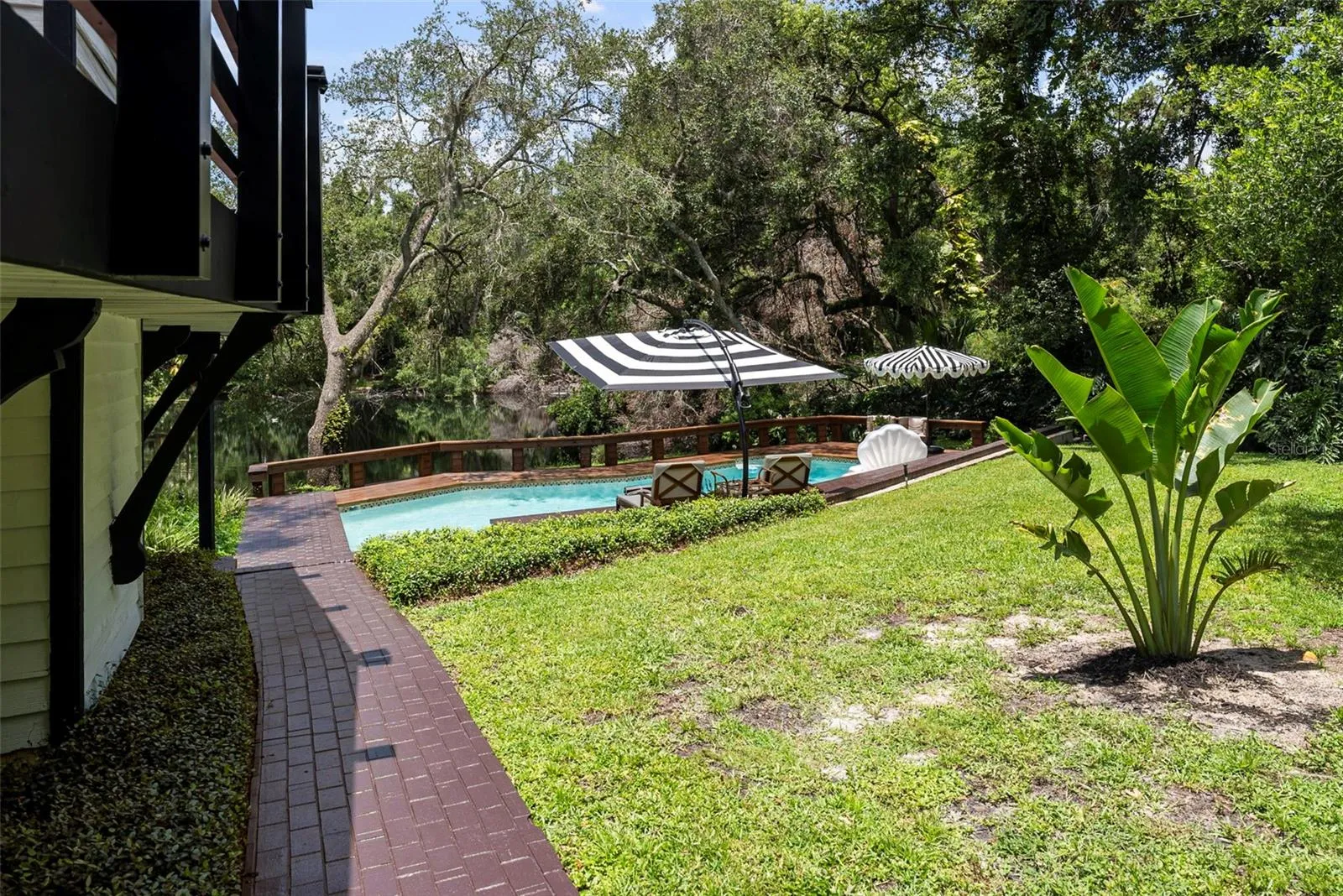 The backyard has been redesigned to create a serene retreat. The pool area includes a newly framed and tiled deck with two tiled steps, tropical landscaping, decorative rocks, solar lighting, and freshly painted brick surfaces. A new pool pump ensures year-round enjoyment. The upgraded irrigation system features new plumbing, an 8-zone sprinkler system, and a dedicated well with a new tank.