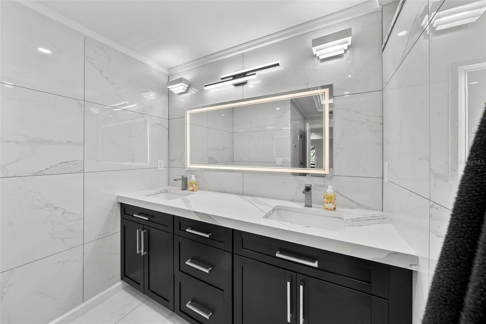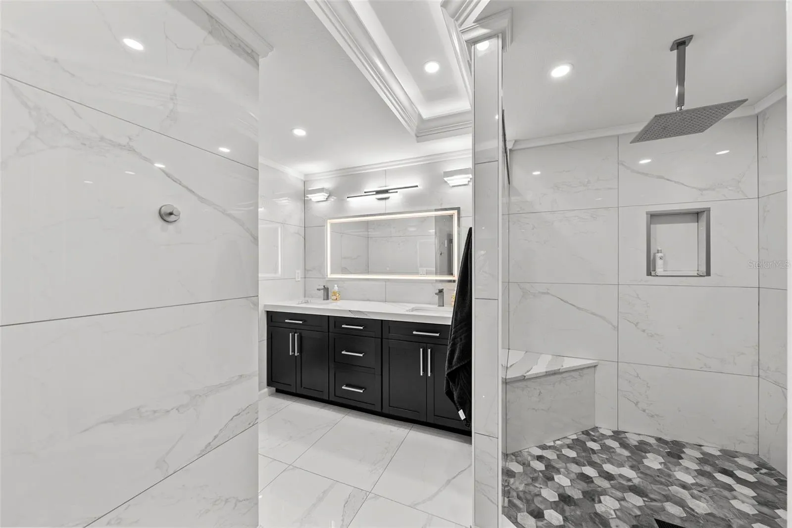 A newly added master suite offers a custom-designed closet system and private en-suite bath. In total, the home includes four fully renovated spa-style bathrooms, each featuring LED-lit mirrors, Jacuzzi and soaking tubs, jet showers with LED temperature lighting, tray ceilings with ambient LED lighting, and designer sconces.