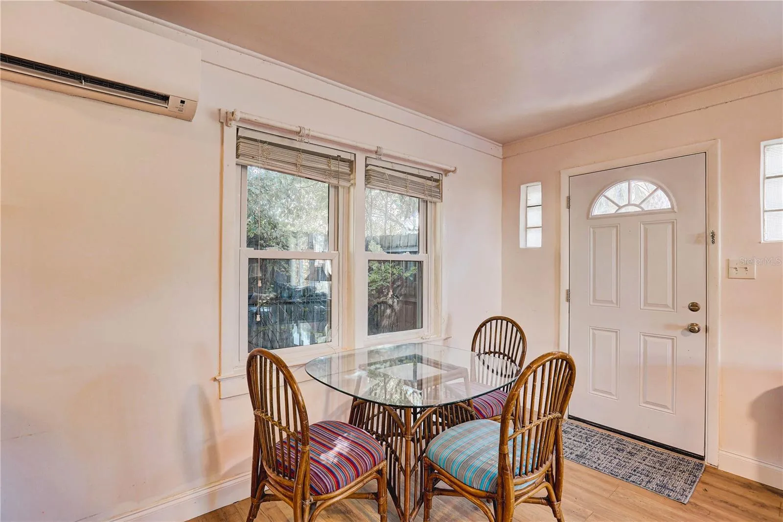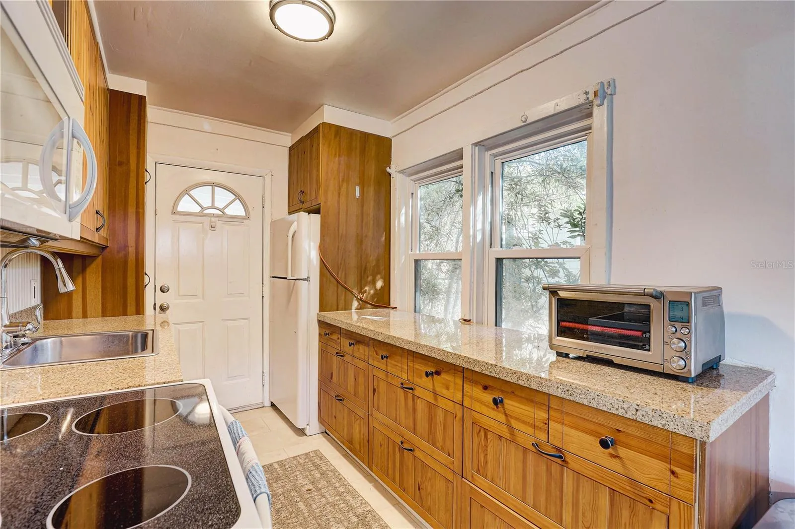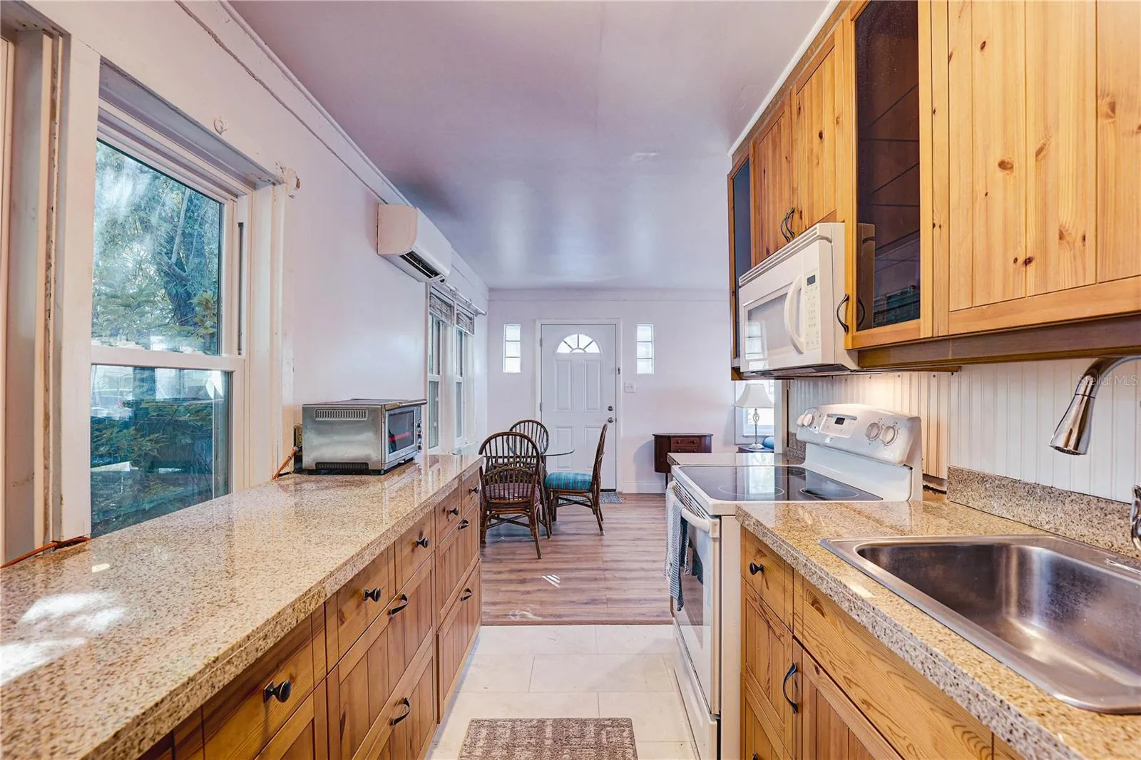 The remodeled galley style kitchen blends style and function with granite countertops, soft close wood cabinetry, and new appliances (2012). The living/dining room (2024) and bedrooms (2020/2025) have been renovated as has the bathroom, while keeping its vintage yellow tiles. Additional updates include hurricane grade windows (2018), a new roof (2020), three Daikin mini split A/C systems (2018), LVP flooring throughout the living/dining area and kitchen (2025), and a steel front door (2023).