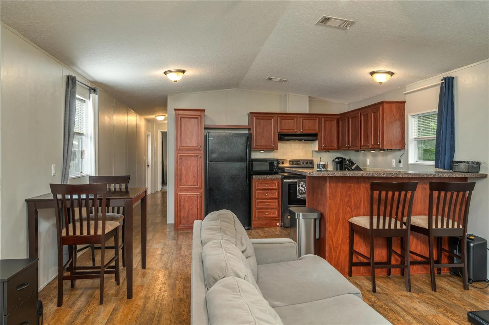 The bright, airy living room flows seamlessly into the dining area and fully equipped kitchen, complete with a convenient breakfast bar perfect for casual meals or entertaining.