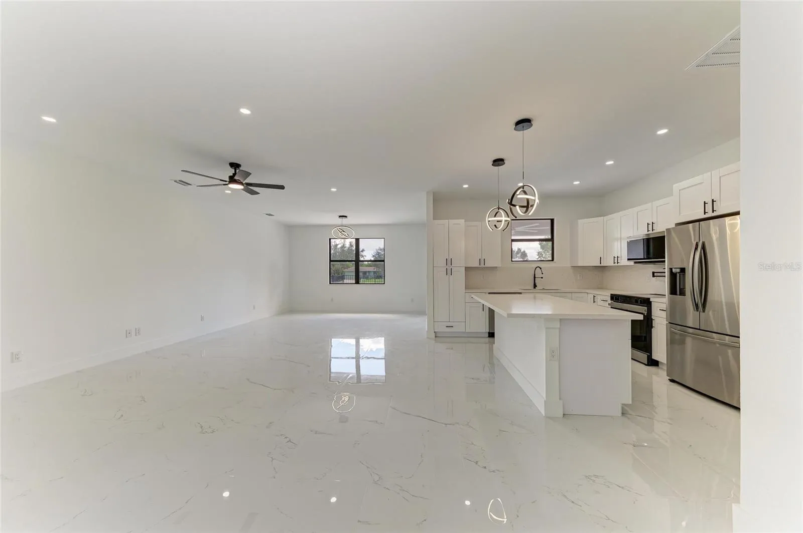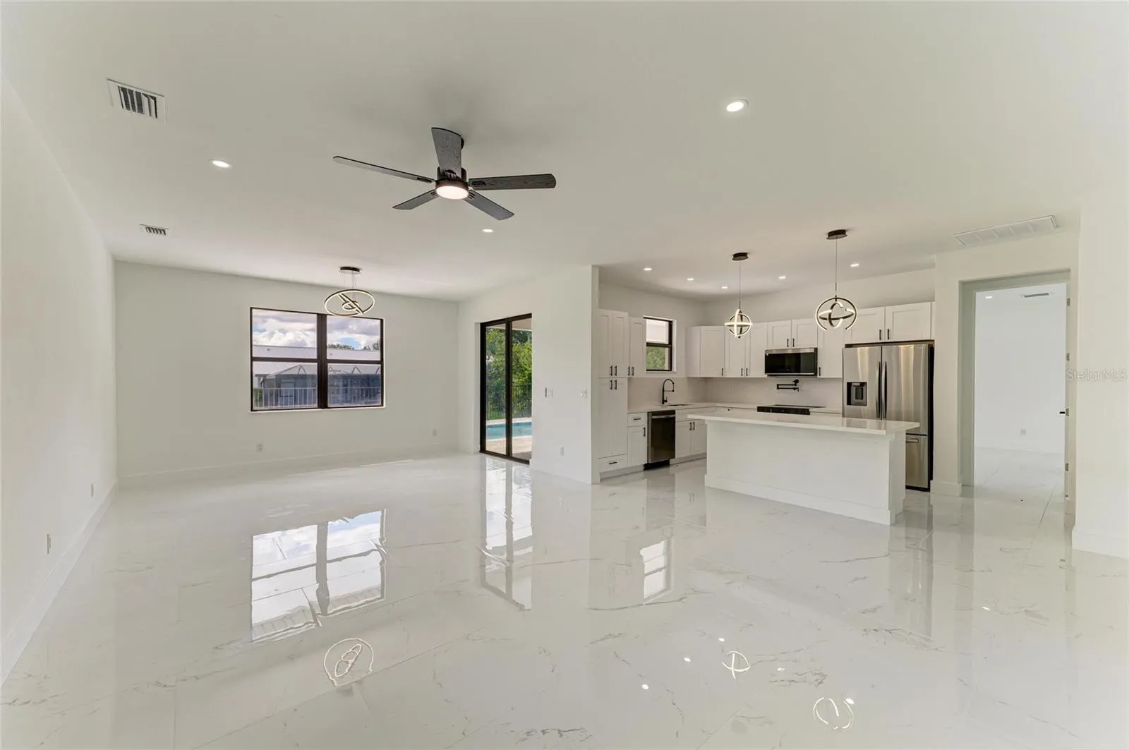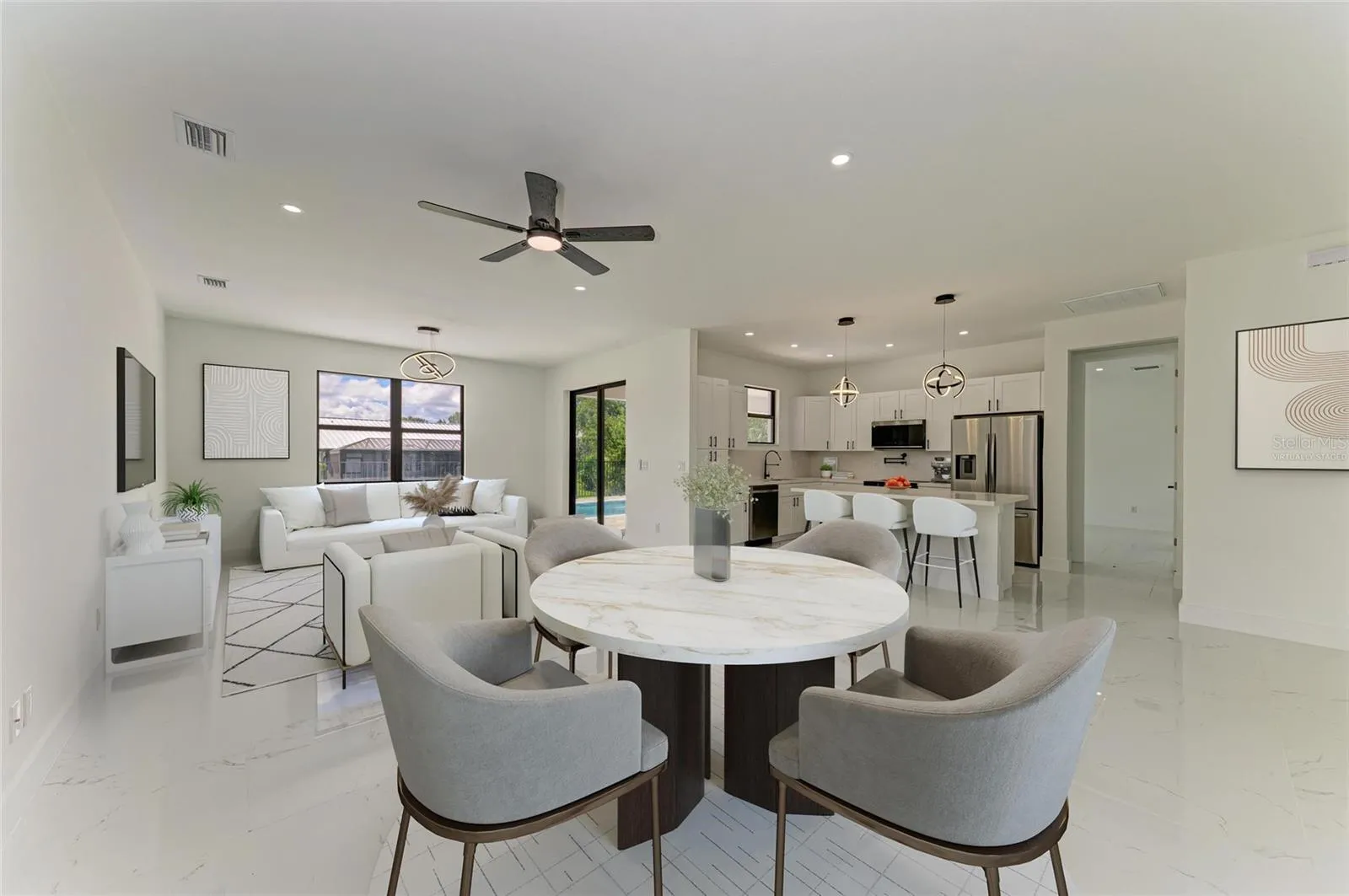 The kitchen showcases granite countertops, premium appliances, upgraded cabinetry, and a large island with bar seating—ideal for casual dining and entertaining. The adjoining dining and flex areas overlook the pool and lanai, creating a seamless indoor-outdoor connection.
