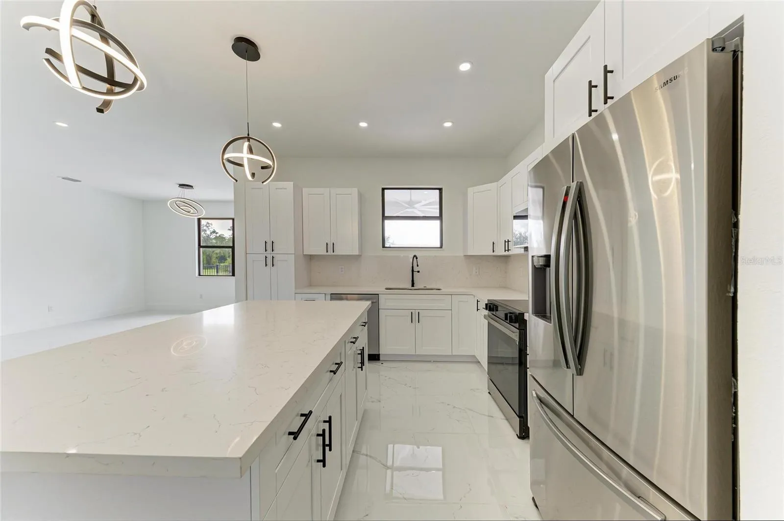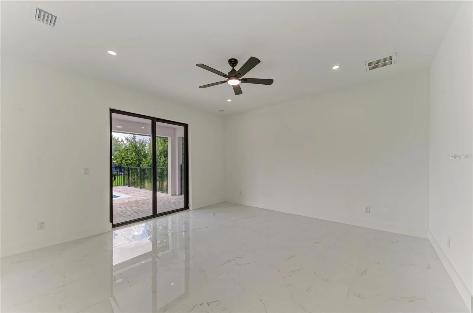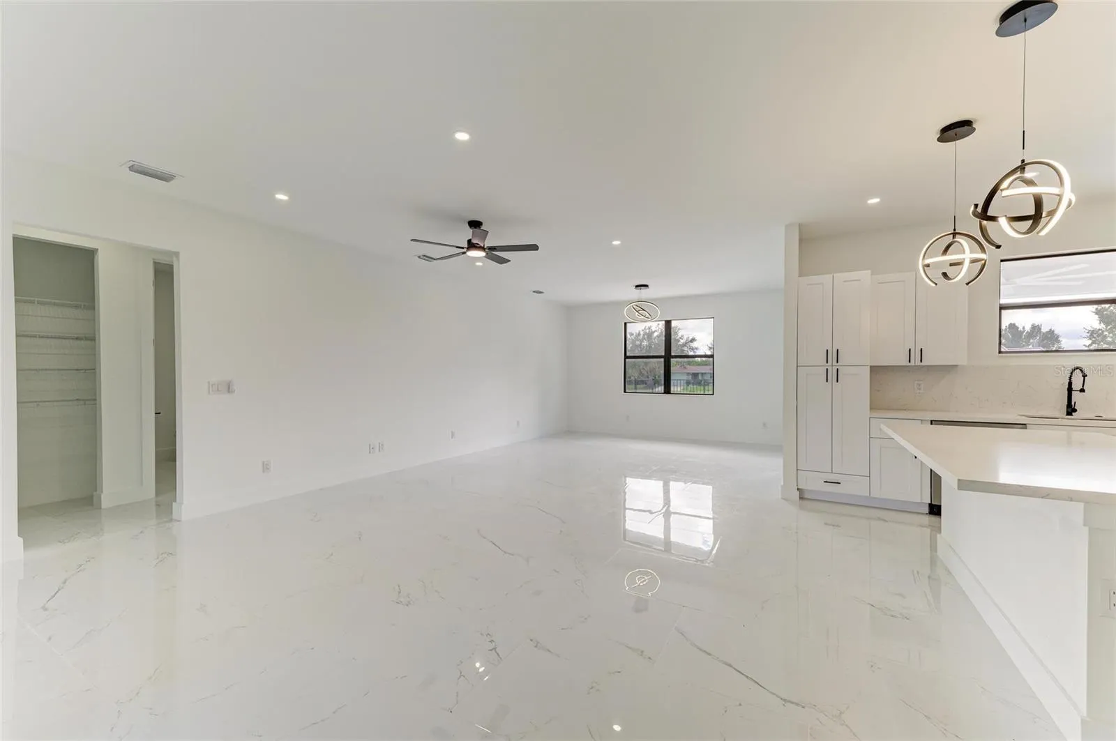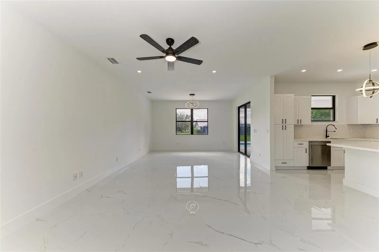 The kitchen showcases granite countertops, premium appliances, upgraded cabinetry, and a large island with bar seating—ideal for casual dining and entertaining. The adjoining dining and flex areas overlook the pool and lanai, creating a seamless indoor-outdoor connection.