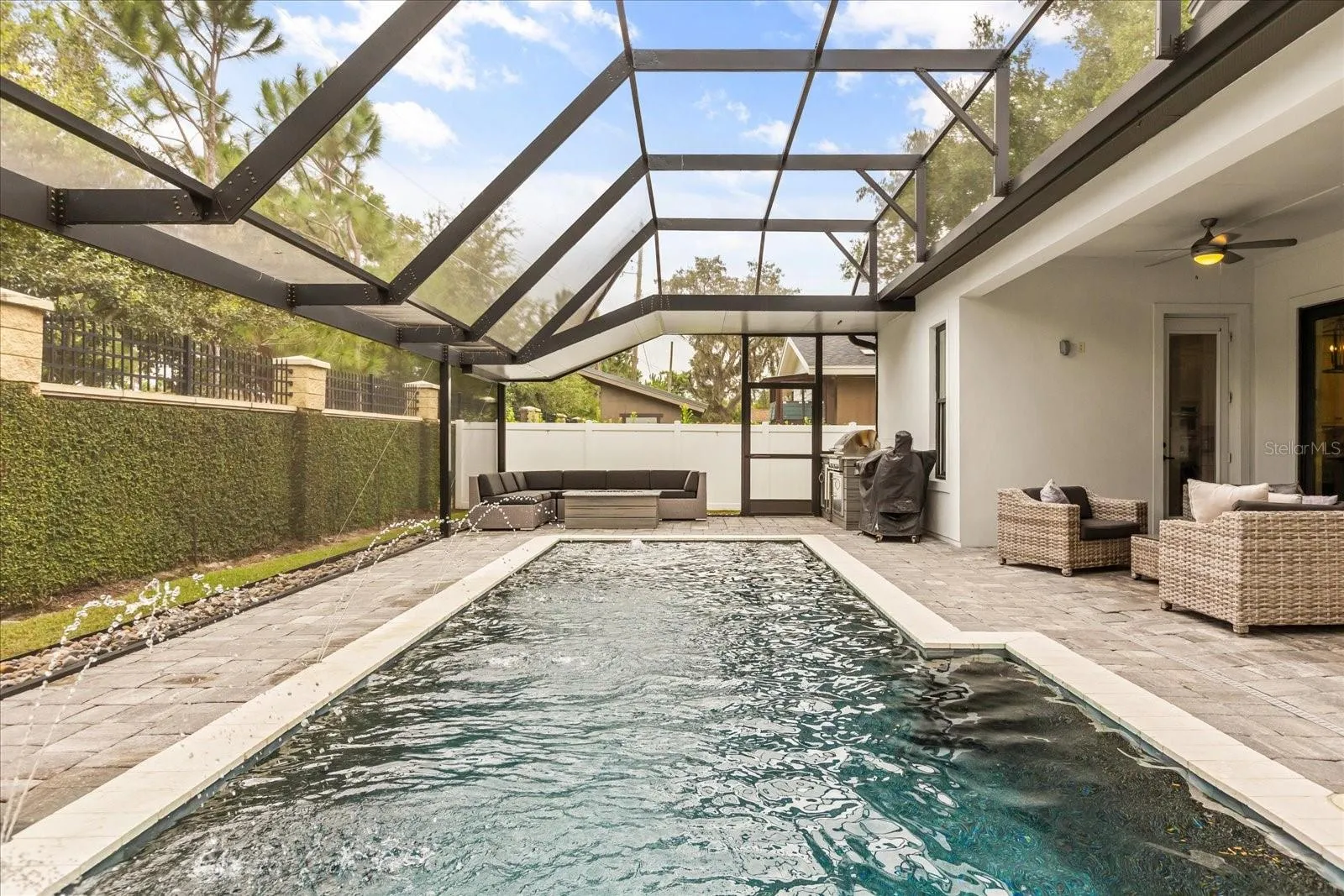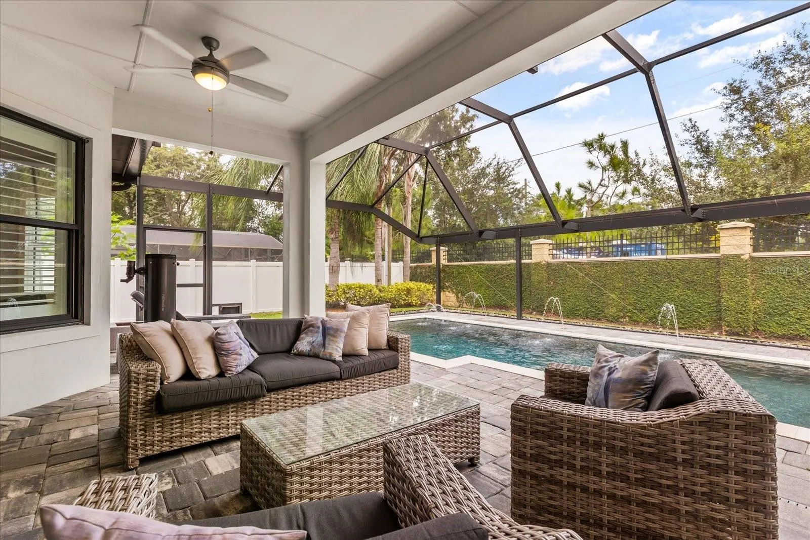 One of the best features of this home is its seamless indoor-outdoor flow. Open the large glass sliding doors and step onto the covered lanai, where there’s plenty of lounge space complemented by dual ceiling fans that keep the area cool and comfortable year-round. The large screened-in pool serves as the centerpiece of the backyard, featuring tranquil fountains and a spacious sunshelf for lounging in the water on a sunny day. This beautifully designed home, with its private outdoor retreat, is a must-see for those looking to live in one of the most desirable neighborhoods in town.