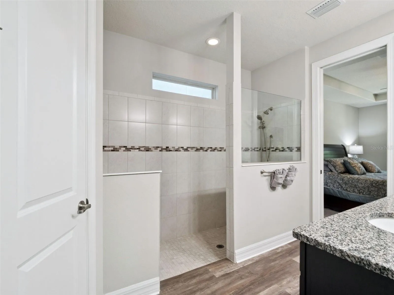 The owner’s suite is a serene retreat offering a large walk-in shower, dual vanities, and a custom-designed closet for optimal organization. Every detail has been thoughtfully considered to combine functionality and style. Step outside to the backyard oasis designed for year-round enjoyment, where an extended covered lanai overlooks a stunning newer pool with intricate stonework, water features, and expanded decking for entertaining. The entire area is enclosed in a large screened enclosure, creating a private, resort-like setting perfect for gatherings or quiet evenings at home.
