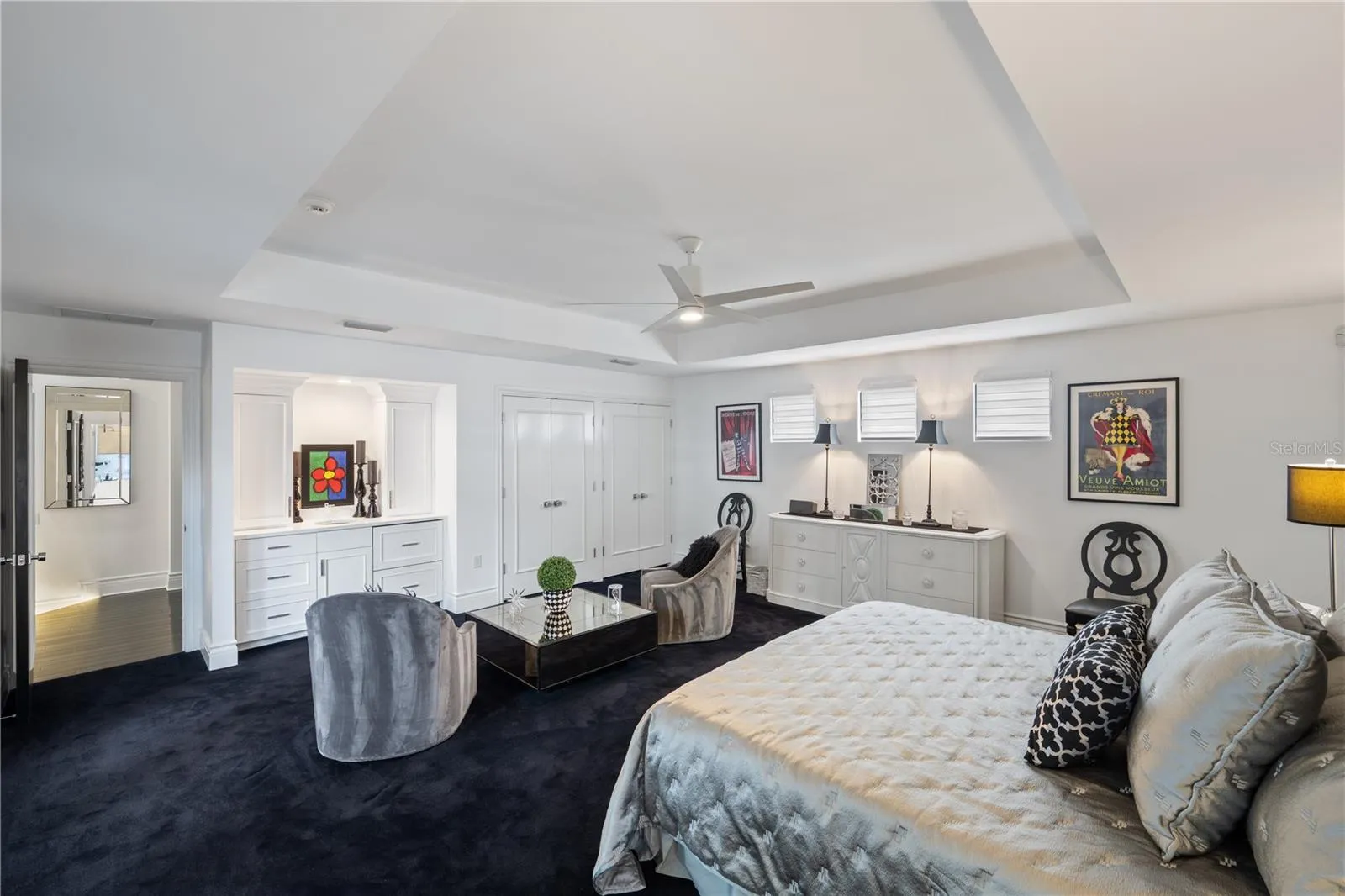 : Walk-In Closet(s), High Ceilings, Kitchen/Family Room Combo, Primary Bedroom Main Floor, Solid Surface Counters, Ceiling Fans(s), Eat-in Kitchen, Split Bedroom, Window Treatments, Solid Wood Cabinets, Stone Counters, Crown Molding, Coffered Ceiling(s)