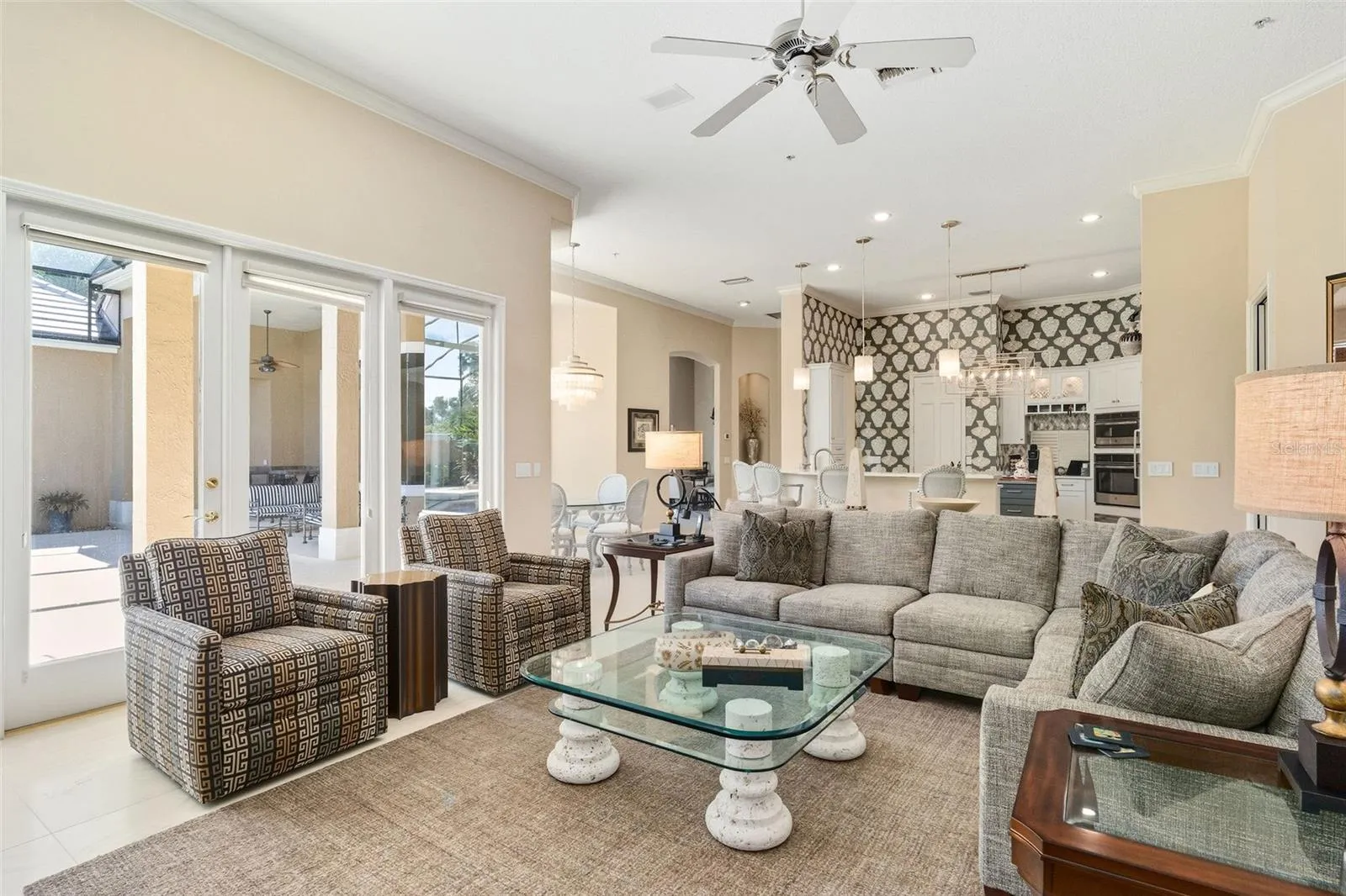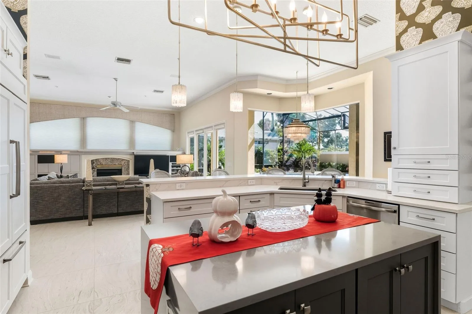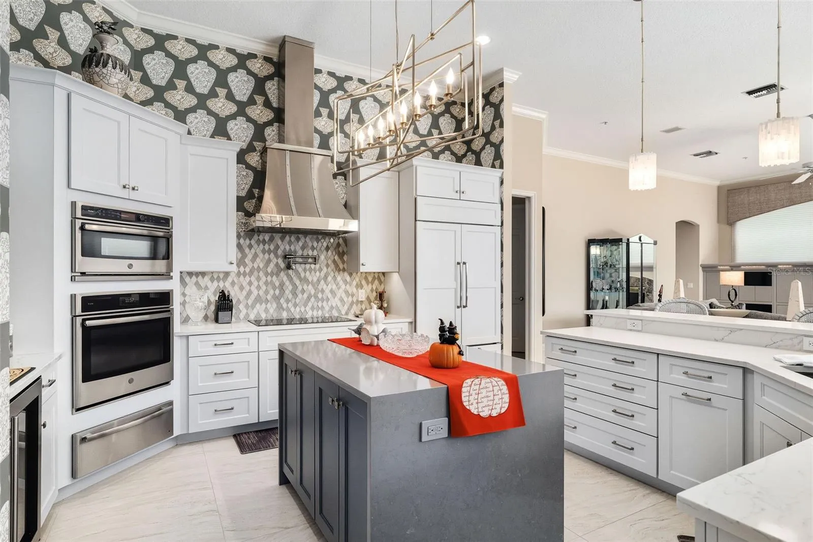 A sleek modern kitchen equipped with a Sub Zero Refrigerator, GE Profile Double Oven, Warming Oven, Custom Stainless Steel Vent Hood, Coffee Bar, Custom Cabinets & Quartz Counters, ideal for entertaining. Easy flow open floor plan with split bedrooms, a huge office with built-ins and large work desk. French doors lead to the covered patio with a newly renovated pool 2024 which has a Sun Deck for lounging, a Gas heated Spa, waterfall, Summer Kitchen & private backyard that completes the serene outdoor living. Brick Pavers lead to the side entry 3 car garage. Huge Laundry/Mud Room just off the Office including Washer/Dryer & butlers Fridge . The exclusive 30 home community has a private boat ramp, tennis/pickle ball court and a playground. Amazing location close to shopping, I-4 and the Altamonte Mall.