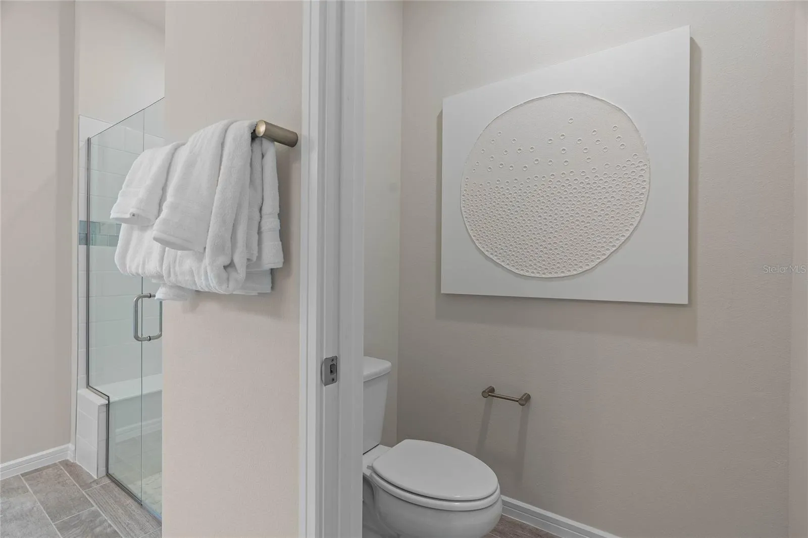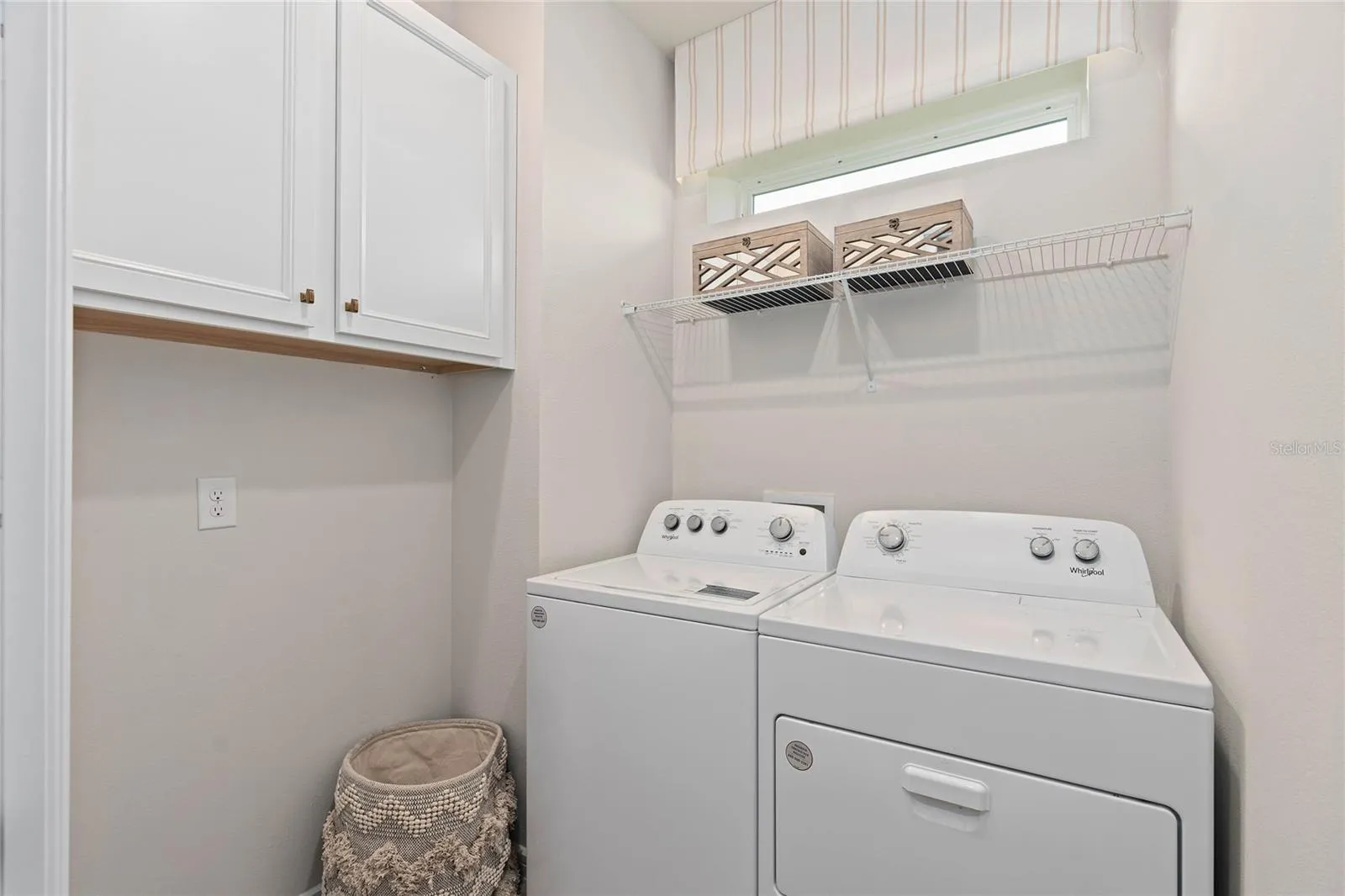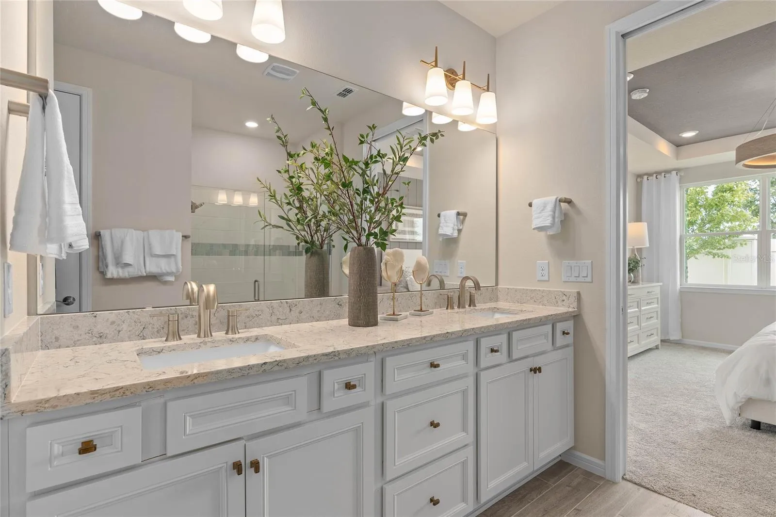 Introducing the exquisite Ellenwood Villa by Del Webb, where luxury meets everyday convenience. This home features 2 bedrooms, an enclosed flex room, and 2 bathrooms in a thoughtfully designed layout that balances style with comfort. The spacious, open-concept kitchen, café, and gathering room are bathed in natural light, creating a warm and inviting space perfect for relaxation or entertaining. High ceilings, ample windows, and a sliding glass door that leads to the covered lanai help blend indoor and outdoor living seamlessly. The kitchen stands as a true highlight, offering both beauty and functionality. It boasts stainless steel Whirlpool appliances (including the refrigerator), elegant 42” soft-close cabinetry, quartz countertops, a stylish tile backsplash, an upgraded faucet, and a sleek stainless-steel single-bowl sink. Whether you’re preparing a meal or hosting guests, this kitchen is designed for ease and elegance. Retreat to the owner’s suite, tucked at the back of the home for privacy. The spa-like en suite bathroom features a frameless glass-enclosed shower with built-in bench, an enclosed toilet, a quartz-topped dual vanity, and a linen closet—creating the perfect environment for relaxation. The secluded secondary bedroom and bathroom offer even more privacy, providing a perfect retreat when you need it most. The front enclosed flex room adds versatility to the home, ideal for a home office, hobby space, or any personal retreat. Designer finishes are throughout, with thoughtful touches such as pendant pre-wiring, 2” faux wood blinds, 8’ interior doors, comfort-height toilets, and Shaw wood-look luxury vinyl plank flooring throughout, except in the bathrooms and laundry room, where tile enhances the overall aesthetic. For the modern homeowner, this home is equipped with smart technology, including a smart thermostat, video doorbell, LED downlights, and extra data ports, ensuring your home is as connected as it is stylish. With its blend of luxury, functionality, and cutting-edge features, the Ellenwood Villa offers an exceptional living experience. Don’t miss the opportunity to make it yours.