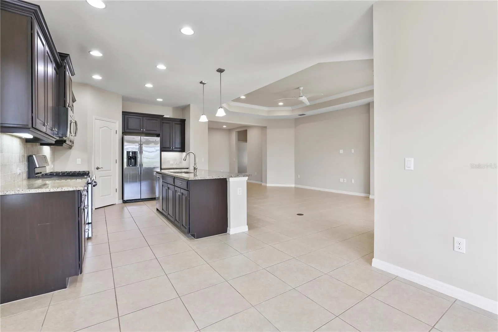 Discover this beautifully updated 3-bedroom, 2.5-bath home located in the gated community of Woodbruck in Sarasota. Spanning 2,233 square feet, this home offers a spacious and inviting living environment with an open layout and high vaulted ceilings. The large modern kitchen features ample cabinet space, stainless steel appliances, and huge island to work on, perfect for all your culinary needs. The common areas are tiled, while the bedrooms are comfortably carpeted. Ceiling fans are installed throughout the home, ensuring a cool and comfortable atmosphere.