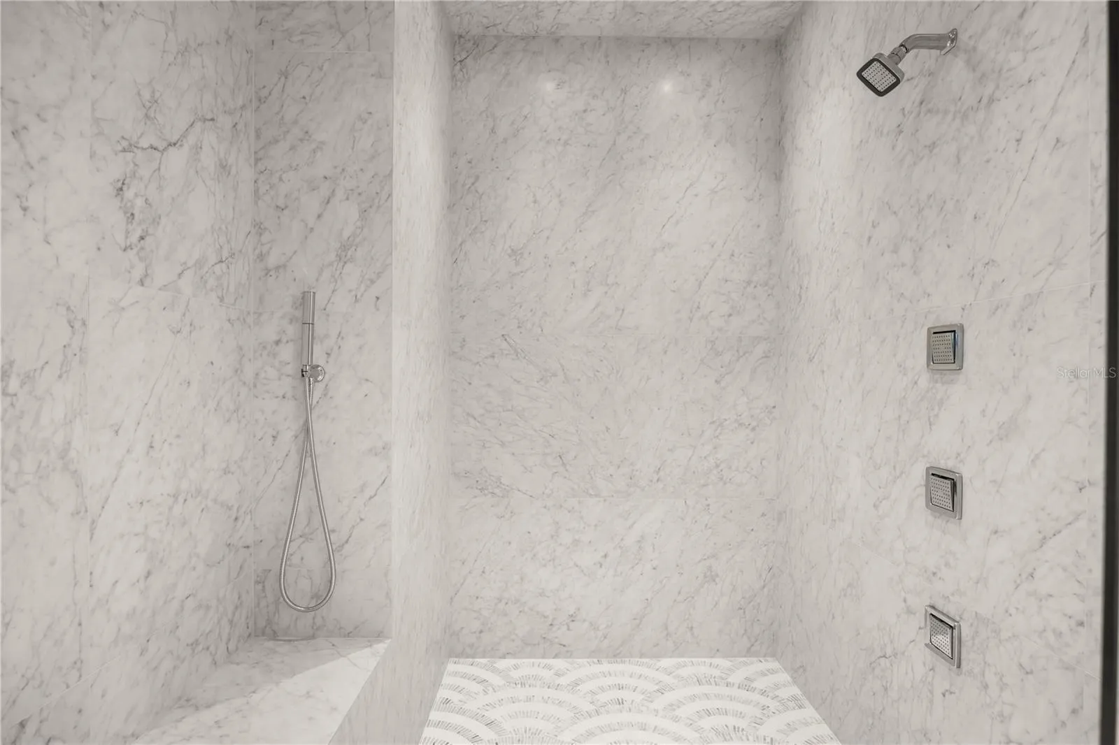 The first floor primary suite, discreetly hidden behind millwork, offers a serene retreat with an opulent closet system and a marble mosaic-clad bathing suite featuring Kohler digital shower technology and MTI tub.