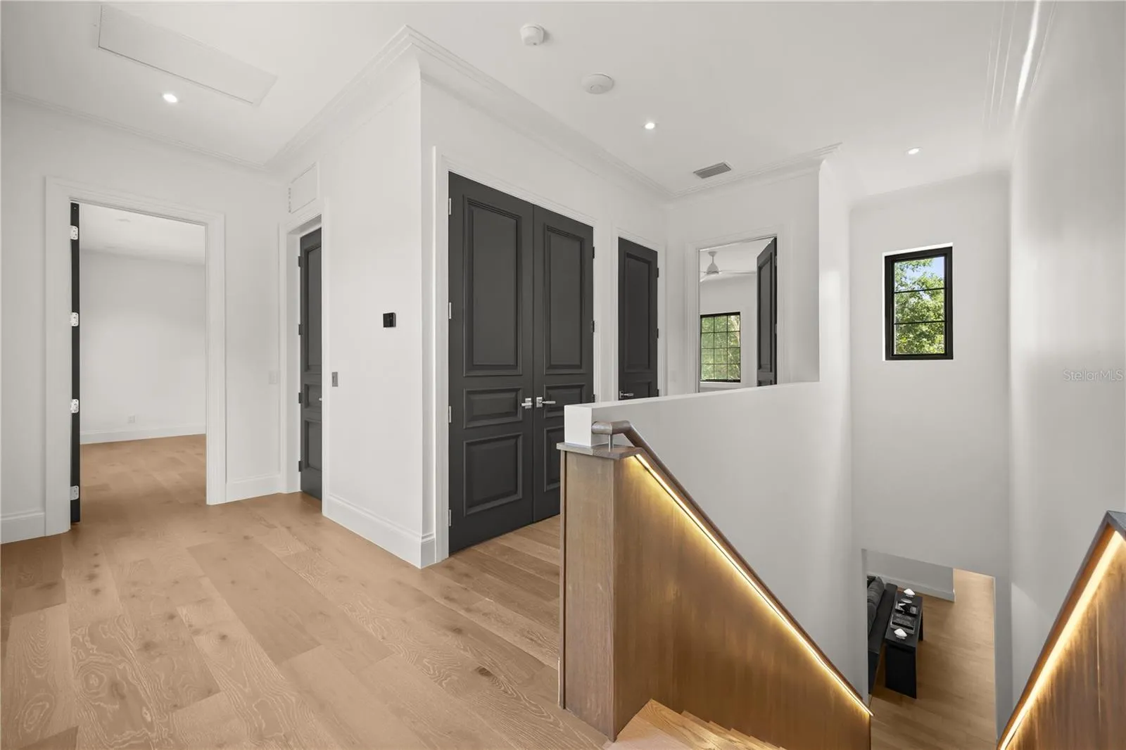Two first-floor guest suites, each with its own bath, are adorned with rift-cut white oak millwork, curved ceilings, and crystal chandeliers. At the heart of the home lies the main salon, where oak detailing and a deco-style stone fireplace with a holographic insert create an atmosphere of understated grandeur.