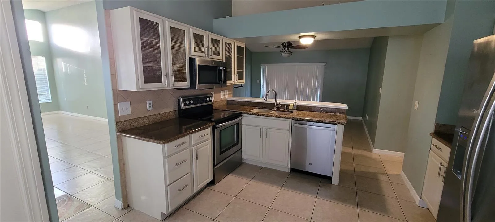 Welcome to this beautifully maintained home featuring 3 spacious bedrooms and 2 full bathrooms, both finished with stunning floor-to-ceiling tile, oversized garden tubs, and marble vanity countertops. The large kitchen is a chef’s dream with granite countertops, tile backsplash, and stylish cabinetry, perfect for meal prep and entertaining. Enjoy the flexibility of a separate Great Room and Family Room, along with a bright, eat-in kitchen area.