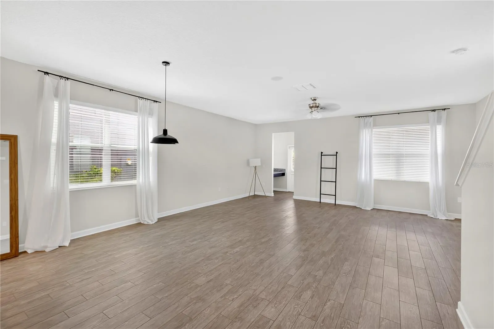 Inside, the interiors are bright, polished, and perfectly balanced — a seamless blend of comfort and contemporary style. The sunlit foyer opens to a versatile formal dining room (currently an elegant home office) and an expansive great room ideal for relaxed entertaining. The chef’s kitchen takes center stage with granite countertops, premium stainless steel appliances, a generous breakfast bar, and thoughtful finishes that elevate every detail. Throughout the main level, wood-look tile flooring adds warmth and continuity, complemented by an elegant powder bath.