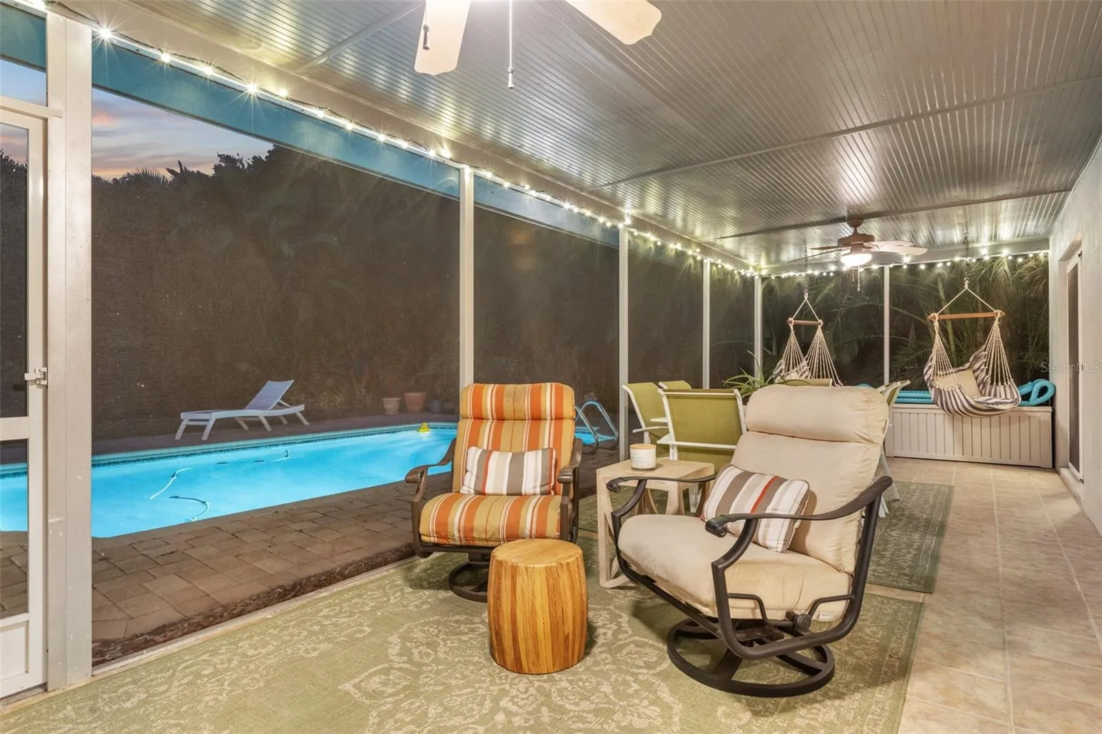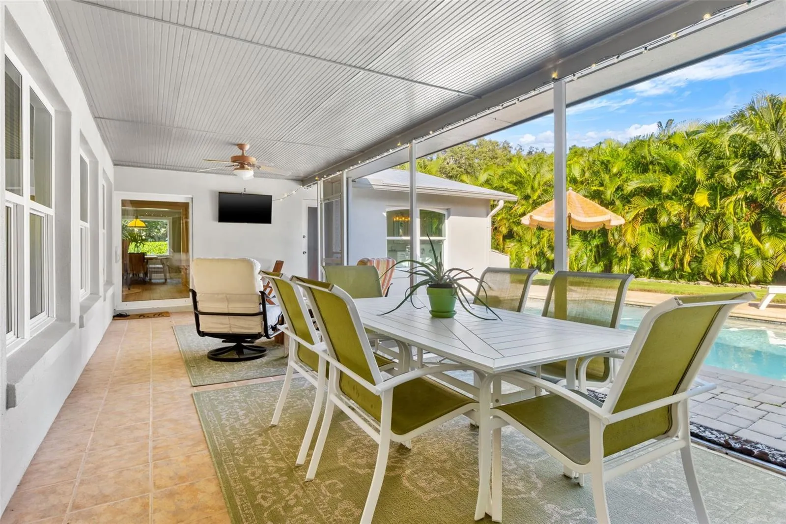 farmhouse sink. Outdoors, Florida living shines: a large screened porch (accessed by a sliding pocket door) overlooks the sparkling pool and fully