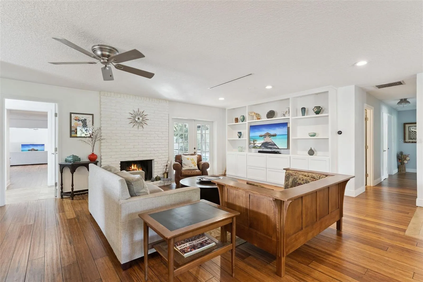 The remodeled kitchen includes a 5’x10’ stone island, stainless steel appliances, a 42” Kenmore range, and opens to generous living and dining areas with a wood-burning fireplace. Additional highlights include a large recreation room with French doors leading to a screened lanai and private fenced backyard oasis, perfect for entertaining.