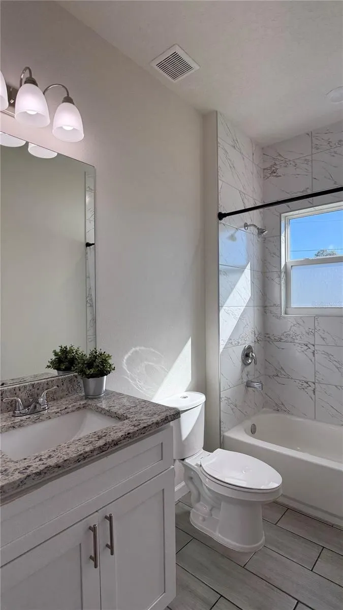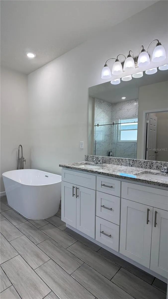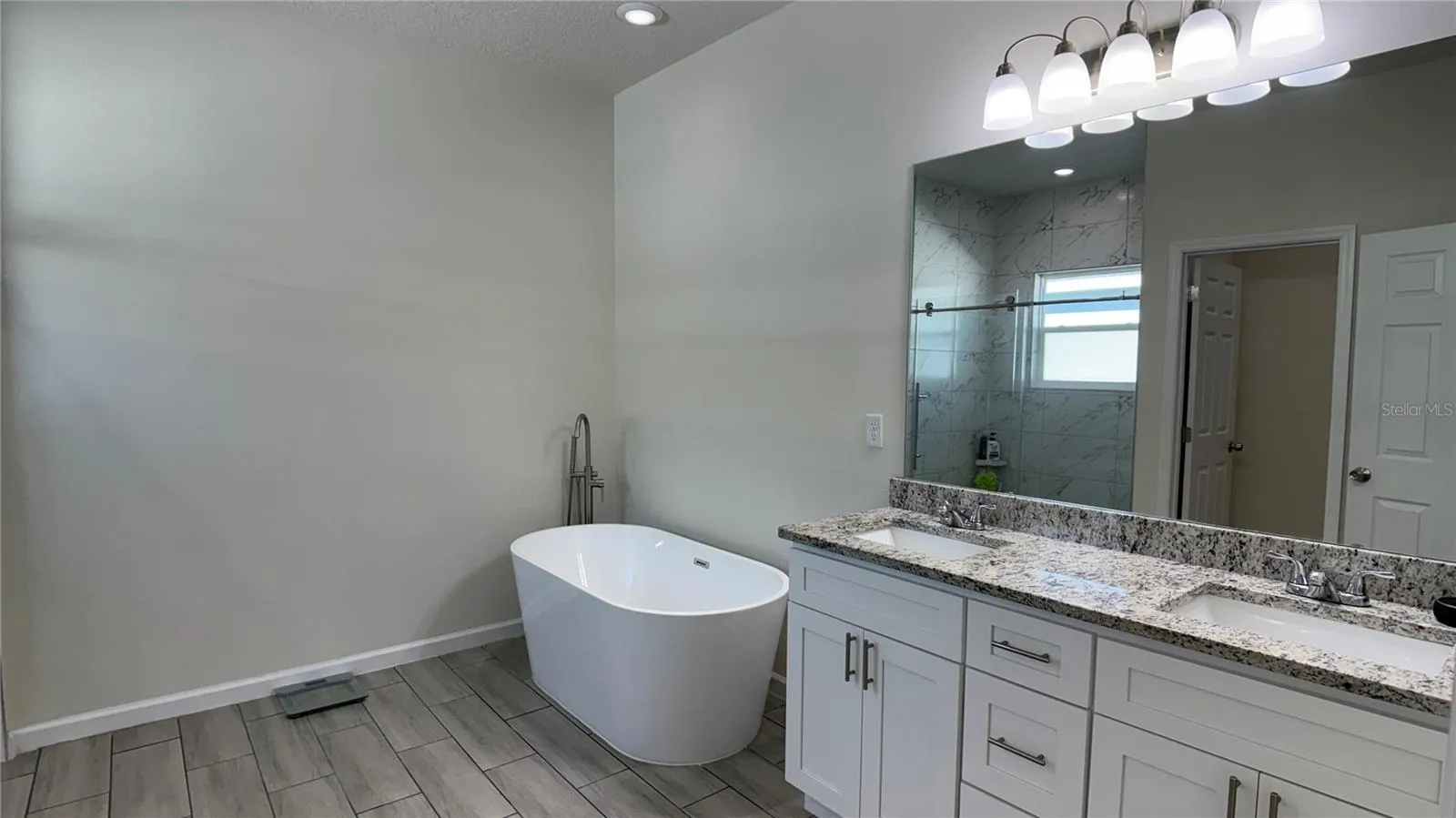 The primary suite includes two walk-in closets and a luxurious ensuite bathroom complete with a soaking tub and stand-alone faucet, dual-sink vanity, separate walk-in shower, and private water closet. The additional bedrooms are generously sized, offering comfort and flexibility for family or guests.