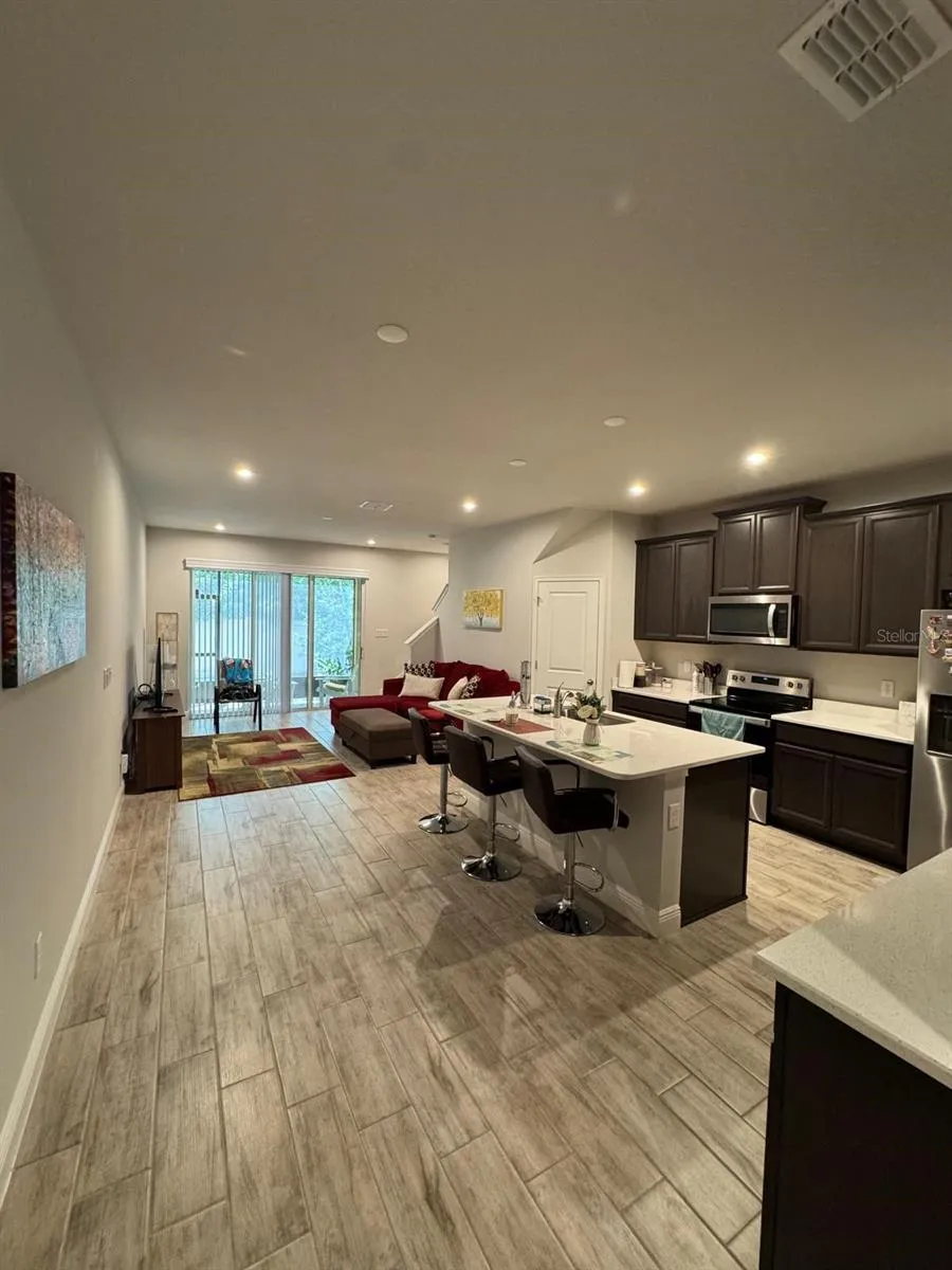 Welcome to this beautifully maintained 3-bedroom, 2.5-bath townhome offering the perfect blend of comfort, style, and functionality. Step inside to an open-concept floor plan with spacious living and dining areas, ideal for entertaining or relaxing with family. The modern kitchen features stainless steel appliances, elegant dark cabinetry, quartz countertops, and a large island with breakfast bar seating. Upstairs you’ll find a versatile loft space perfect for a home office, playroom, or media area. The primary suite includes a walk-in closet and a spa-inspired ensuite bathroom with dual sinks and a glass-enclosed shower. Additional highlights include tile flooring throughout the main level, a private patio area, and a one-car garage with extra driveway parking. Conveniently located near shopping, dining, and major highways, this home offers a low-maintenance lifestyle without compromising on space or style. Move-in ready and waiting for you to make it your own!