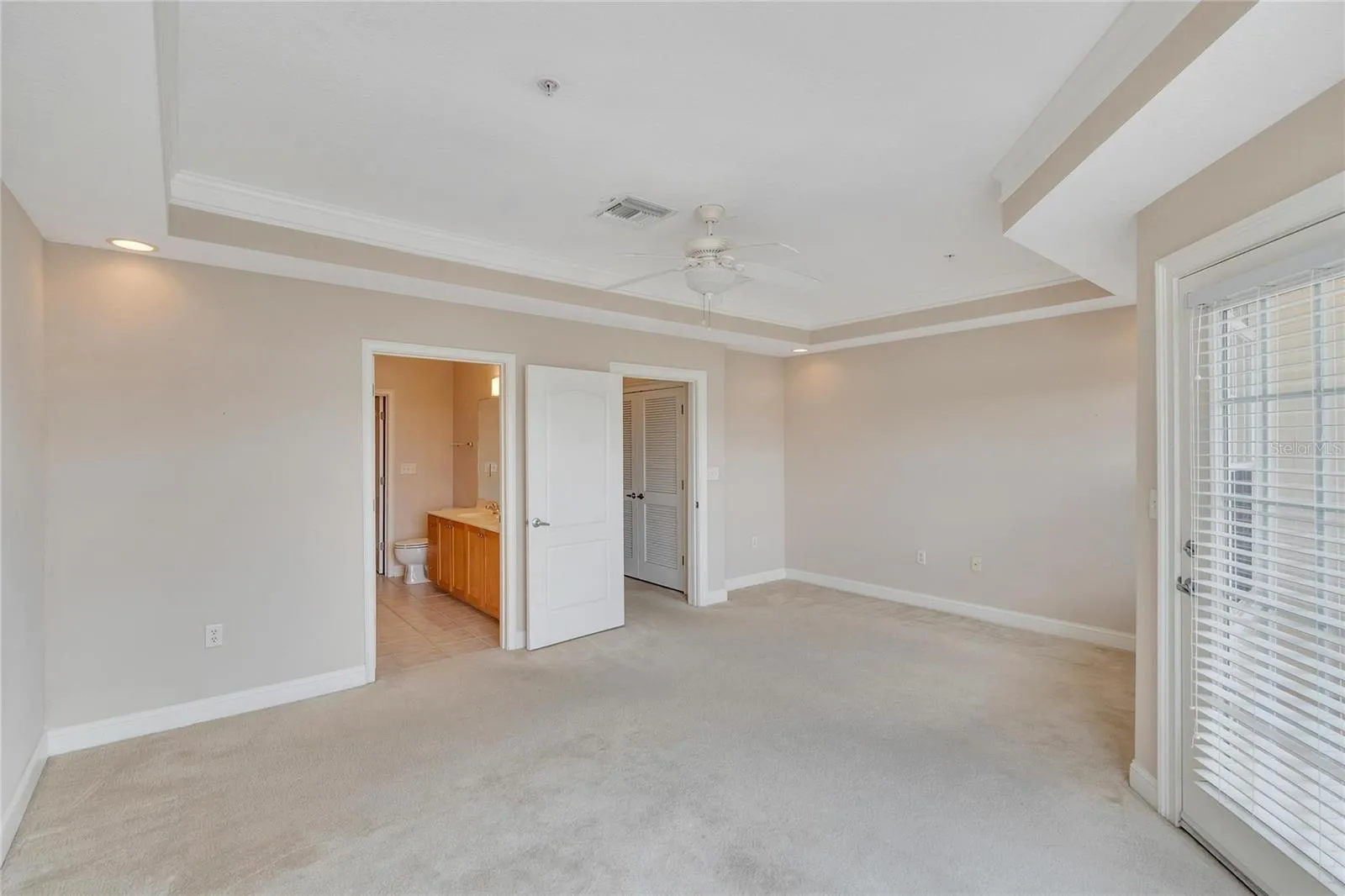 A private guest suite on the main level offers a comfortable space for visitors, complete with a full bath and walk-in closet. On the second floor, the primary suite is a true retreat featuring tray ceilings, a private screened balcony overlooking the water, and a spa-like bathroom with dual vanities, a soaking tub, and a walk-in shower. The suite also includes a large walk-in closet and in-suite laundry hookups for added convenience.