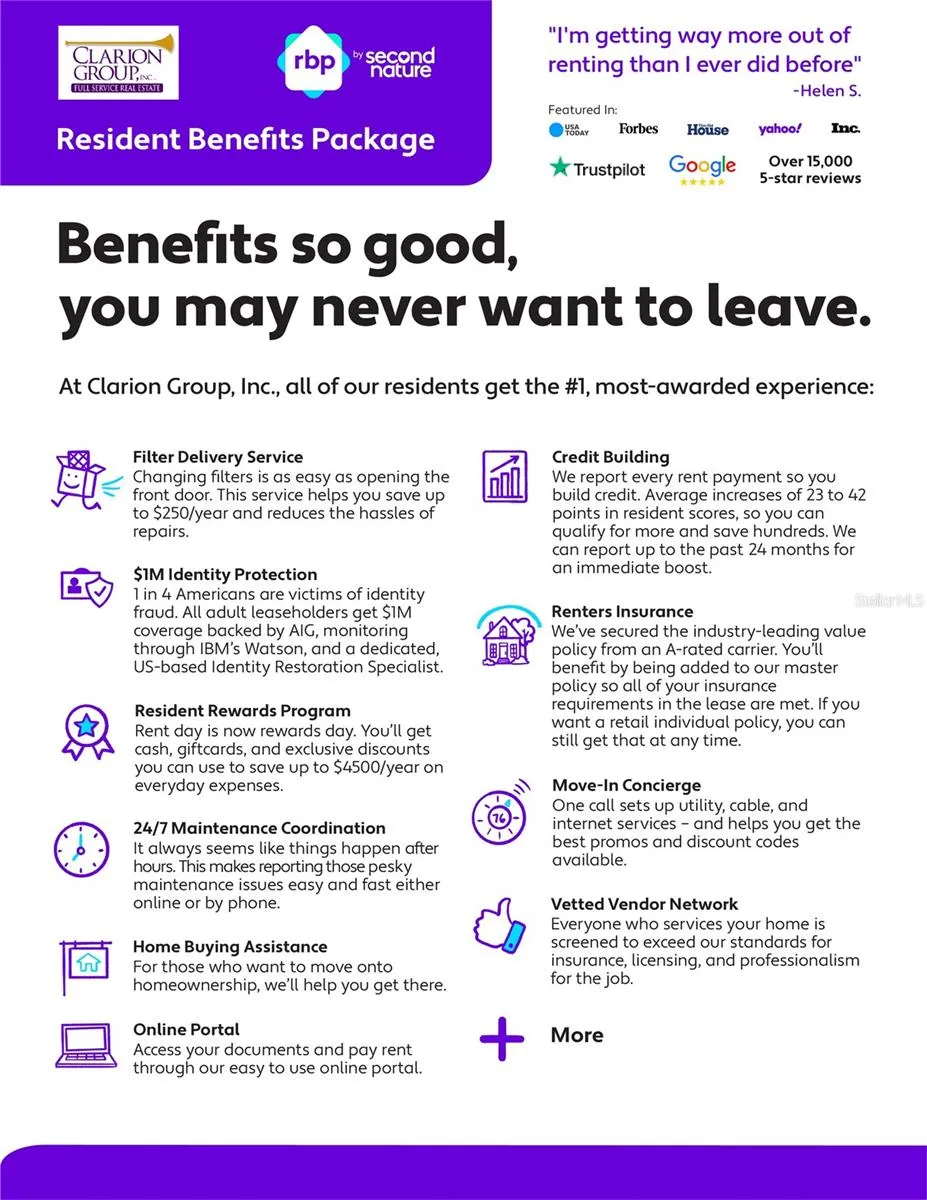 All Clarion Group, Inc. residents are enrolled in the Resident Benefits Package (RBP) for $40.00/month which includes renters insurance, HVAC air filter delivery (for applicable properties), credit building to help boost your credit score with timely rent payments, $1M Identity Protection, move-in concierge service making utility connection and home service setup a breeze during your move-in, our best-in-class resident rewards program, and much more! More details upon application.