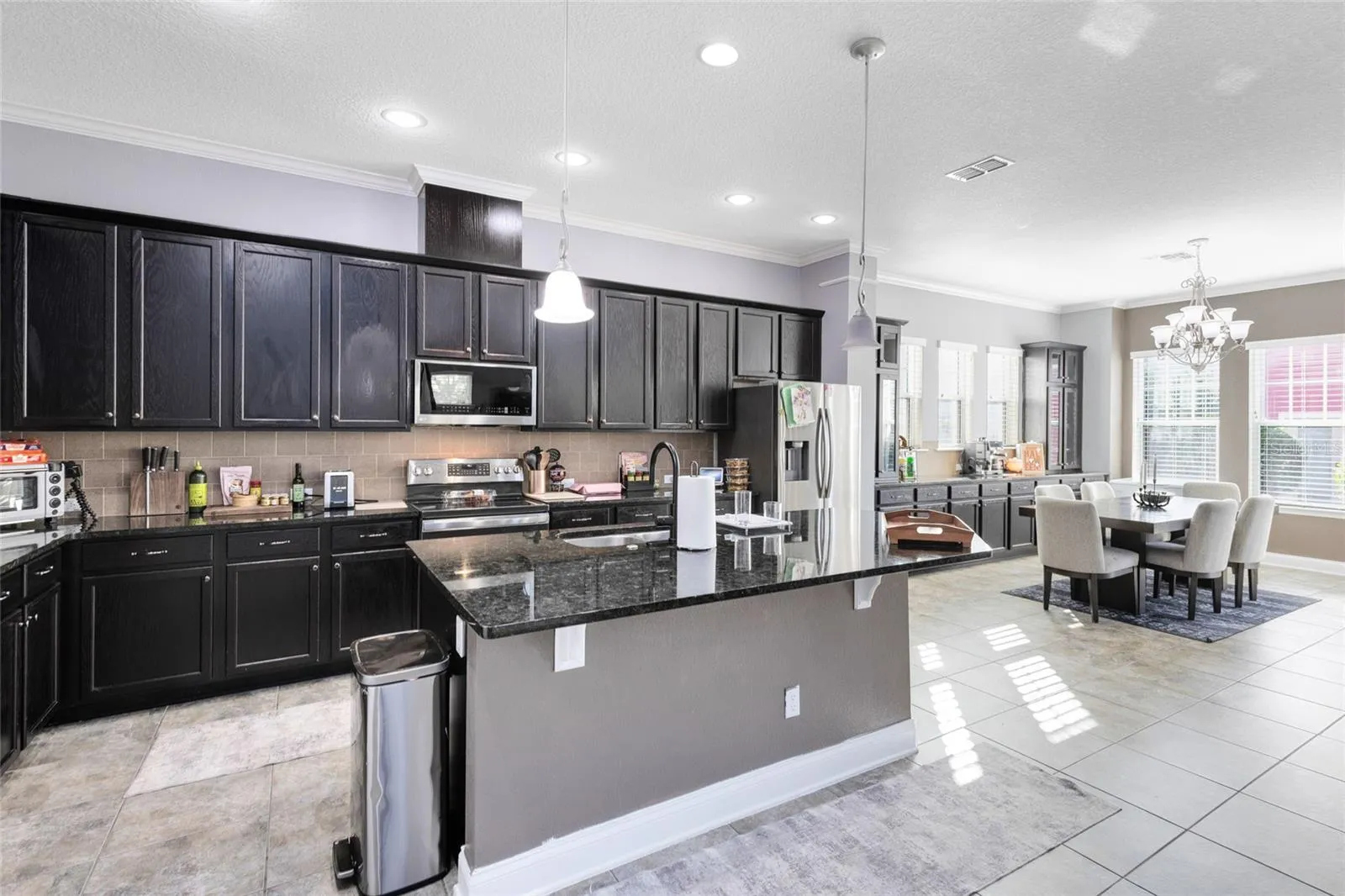 The chef’s kitchen features rich mocha cabinetry extending into the dining area, a large center island with breakfast seating, and elegant pendant lighting. From here, step outside to the covered porch and fenced grass area, creating a seamless indoor-outdoor flow.