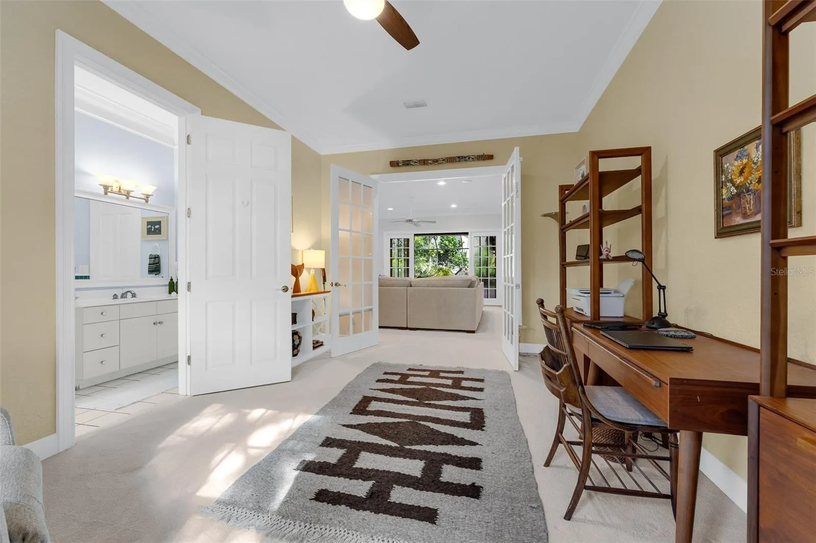 If you work from home you will love the bright, dedicated office space with it’s French doors, built-in shelving, storage drawers large windows and closet. The owner’s suite is a private retreat overlooking the pool and gardens. There are French doors leading to a cozy sitting area with wood floors and built-in shelves. Perfect for cuddling up with a good book, an exercise area or perhaps crafting. The spa-inspired bath has a soothing spa tub with separate walk-in shower, dual vanities, dual linen closets and dual walk-in closets. Two of the remaining spacious bedrooms have been set up as a sitting area and bedroom suite, perfect for a multi-generational living or extended family.