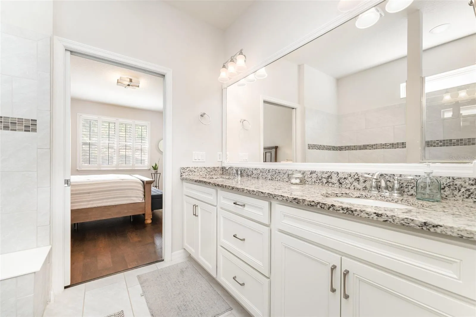 The primary suite is privately situated at the rear of the home, offering peace and privacy with no rear neighbors. The en suite bath features dual vanities, a large tiled walk-in shower, linen closet, and a custom-shelved walk-in closet.