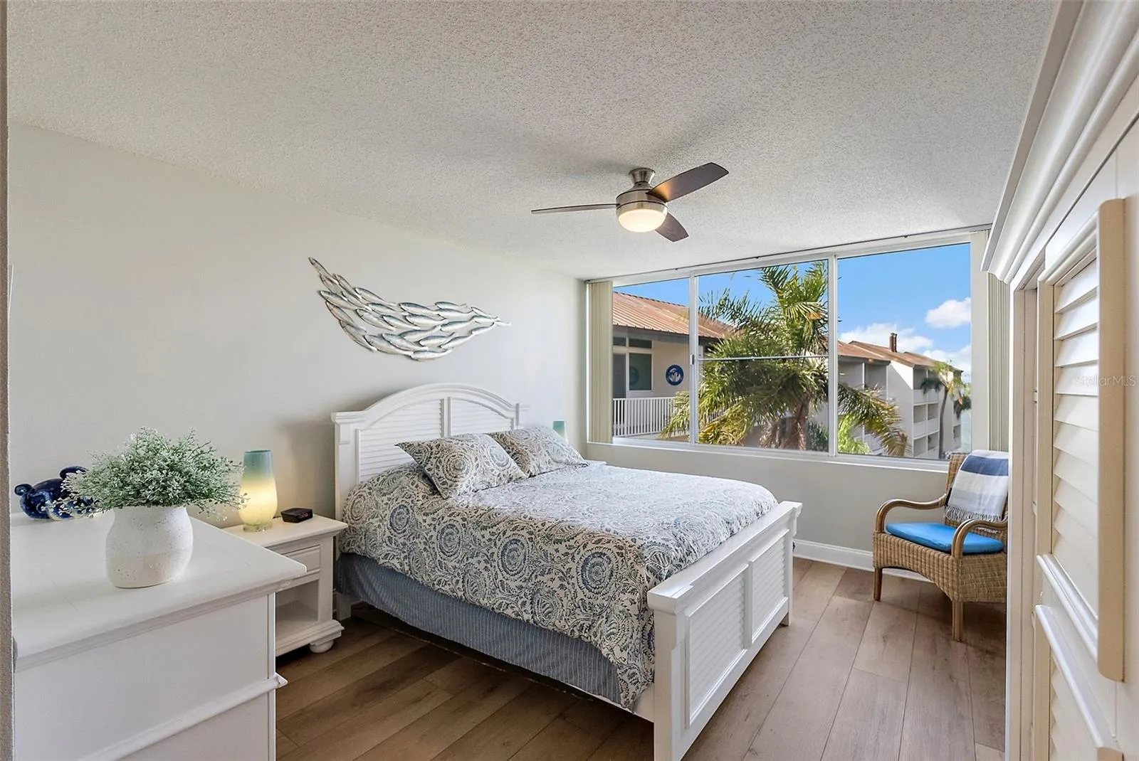 Step into the spacious great room with soaring 12-foot ceilings, a rarity that enhances the natural light and creates an airy, open ambiance. A custom fireplace anchors the living space, offering both warmth and a striking architectural focal point. The expansive private balcony invites you to savor panoramic views of the bay—perfect for morning coffee, sunset cocktails, or simply relaxing in coastal serenity.