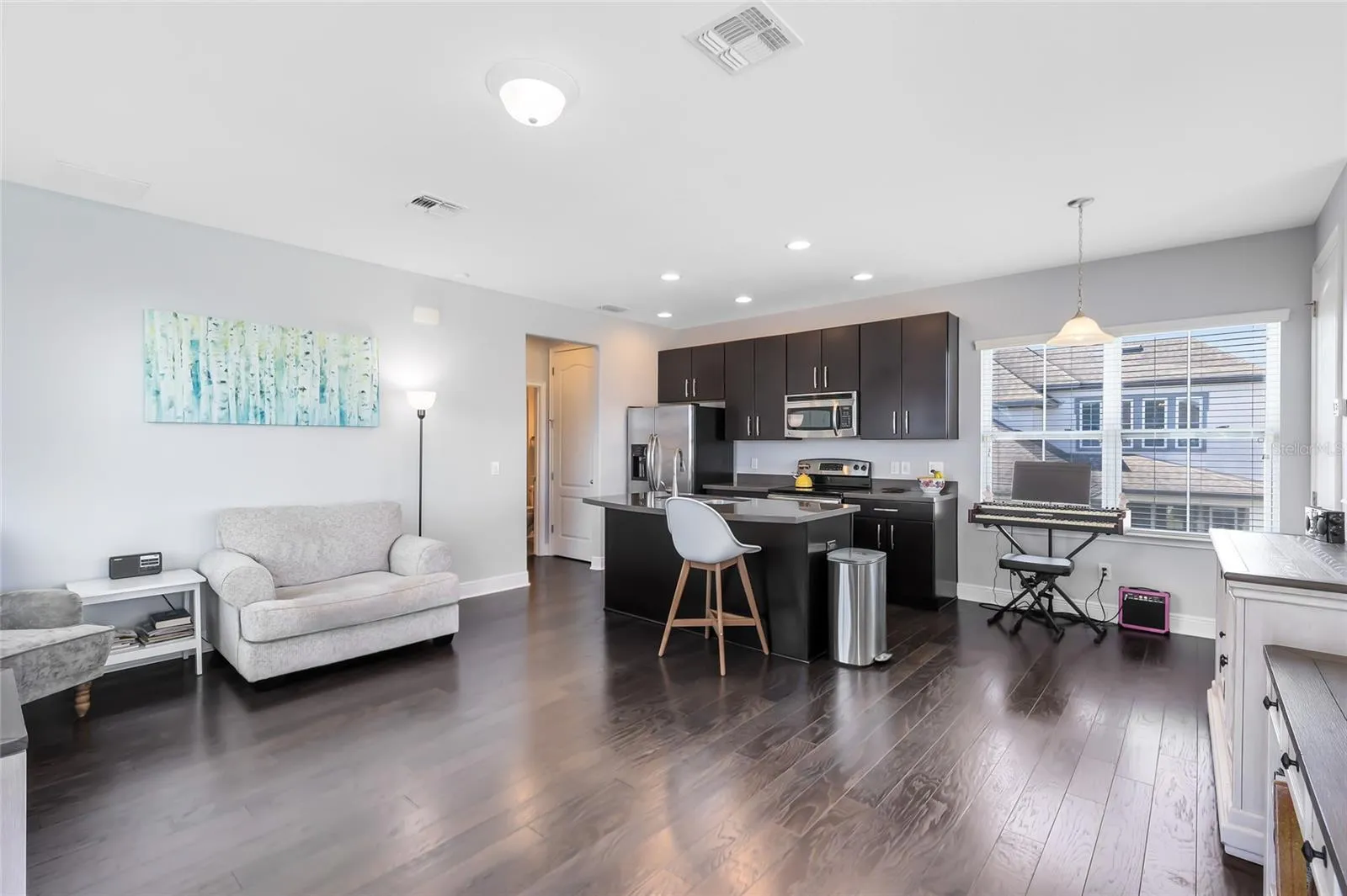 Inside, a fresh, modern palette and white oak-style LVP flooring flow seamlessly throughout the first floor, complementing the open-concept layout and upgraded finishes. The ground-level primary suite enhances accessibility and comfort, while the sun-filled two-story great room impresses with large windows that bathe the space in natural light. The chef’s kitchen showcases pristine quartz countertops, a spacious island, a gourmet wall oven, and designer lighting—ideal for both casual meals and formal entertaining.