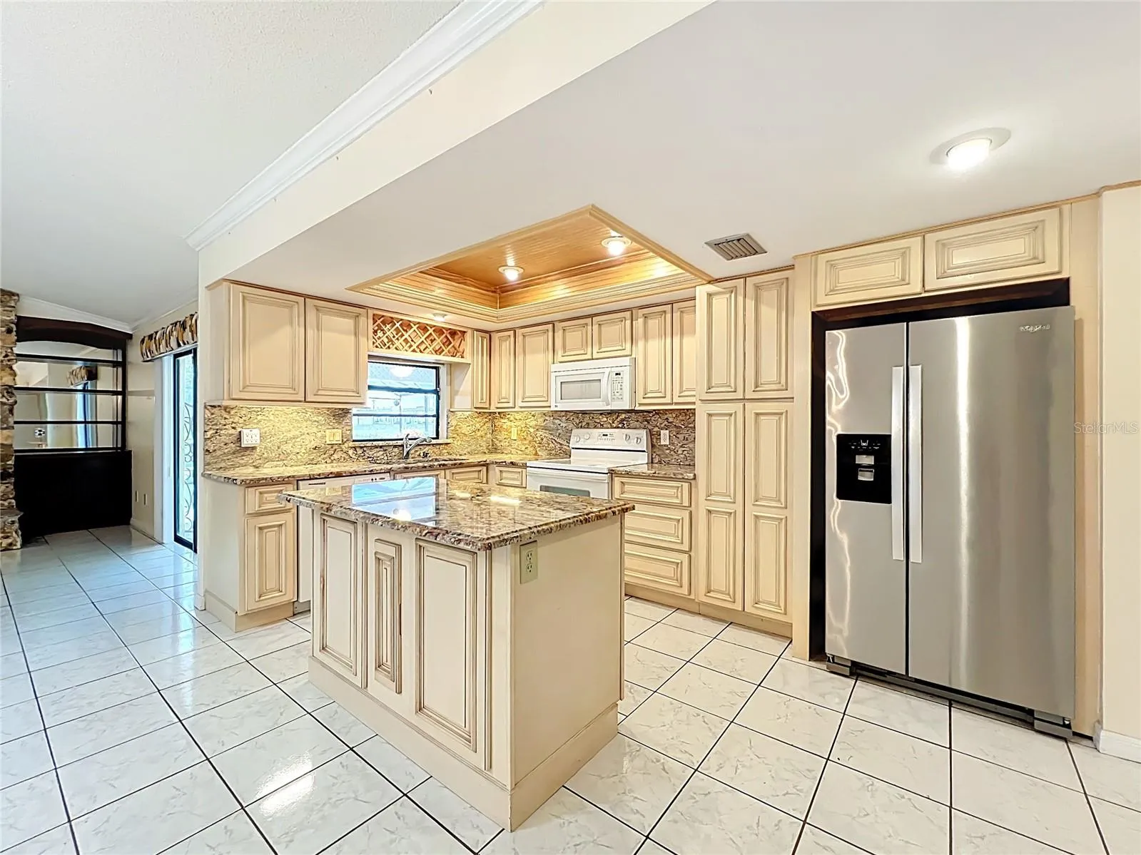 Inside, you’ll find an open, bright floor plan with stylish updates throughout. The kitchen serves as the heart of the home, featuring brand-new granite countertops, abundant prep space, and a separate island—ideal for cooking and entertaining. The home includes a formal living room, formal dining room, an eat-in kitchen, and a large family room highlighted by a wood-burning stone fireplace and sliders leading to the pool.