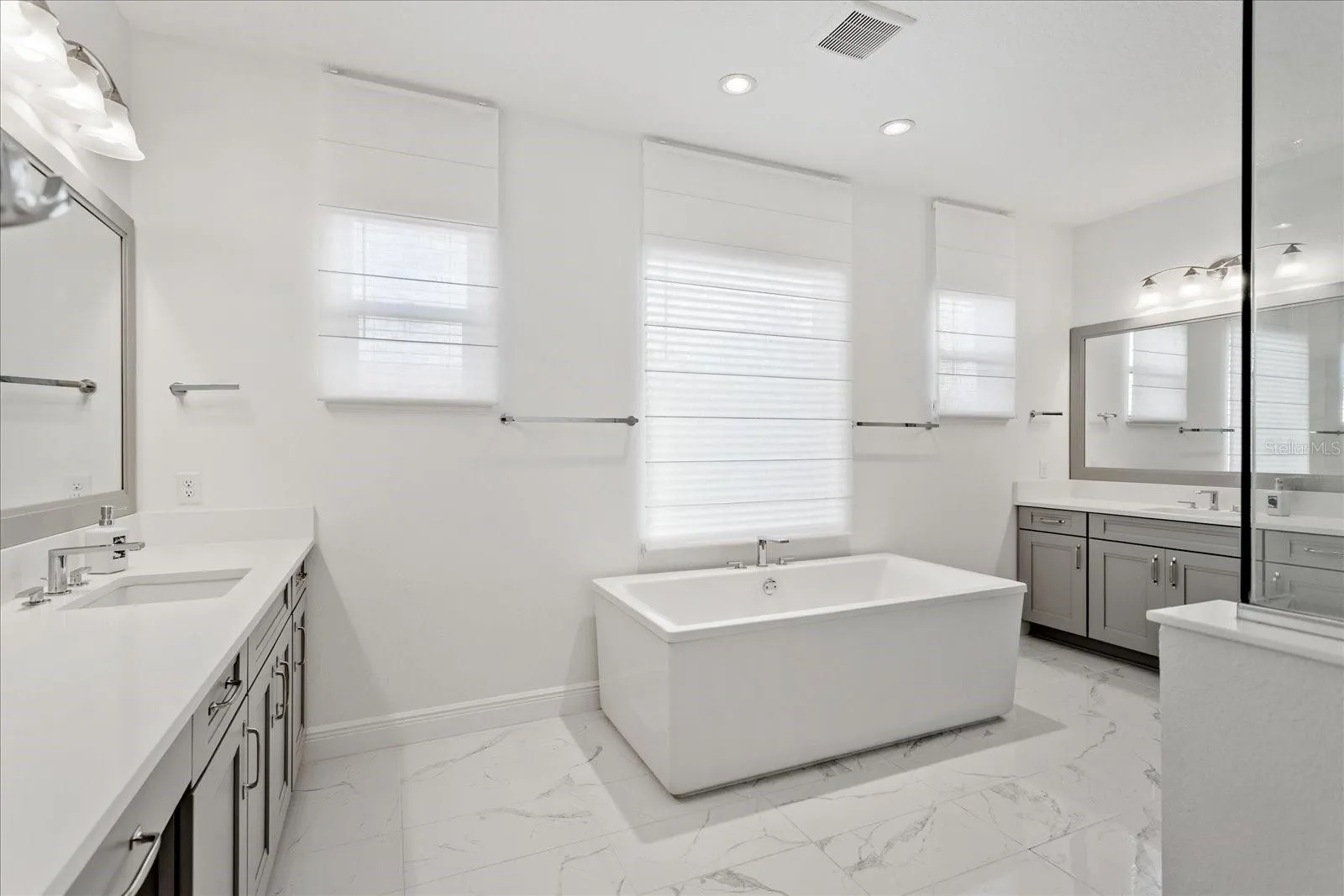 The luxurious primary suite is your private retreat, offering dreamy, layered curtains, gorgeous crystal chandelier, a stand-alone soaking tub, and a custom walk-in closet with built-ins.