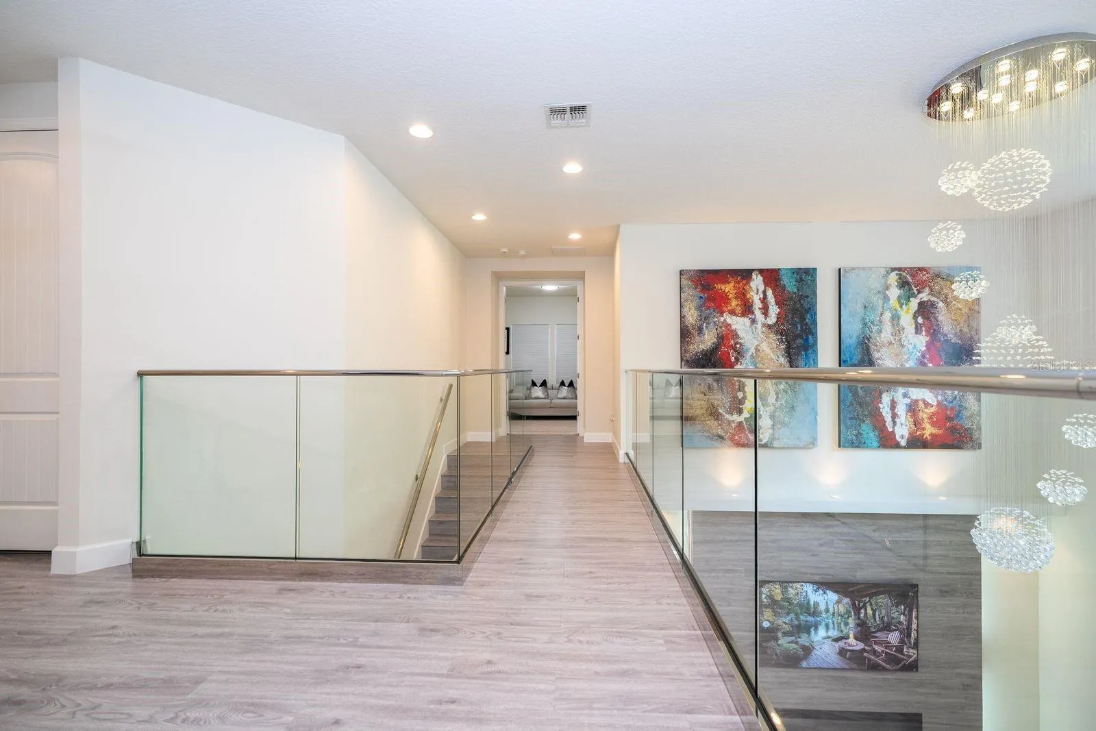 The home offers a thoughtfully designed floor plan, with the primary suite and three additional bedrooms located on the upper level, as well as a private movie theater complete with a 95-inch screen and projector. A full bathroom is conveniently located on the main floor for guests. Elegant glass stair rails, 8-foot interior doors, custom window treatments, a show-stopping dining room chandelier, and personalized his-and-her closets add to the home’s distinct sense of luxury. Step outside to a spacious backyard with a covered lanai, a separate entry to the pool bath, and space designed for both relaxation and entertaining. The oversized tandem three-car garage provides ample room for vehicles and storage.