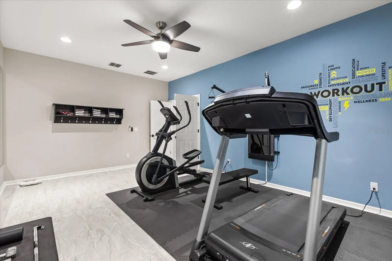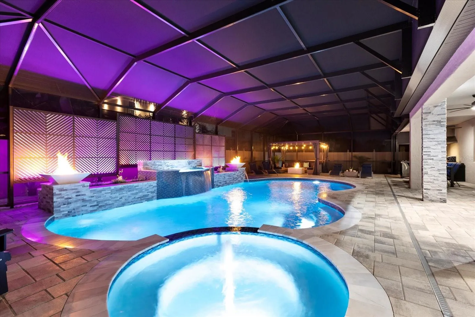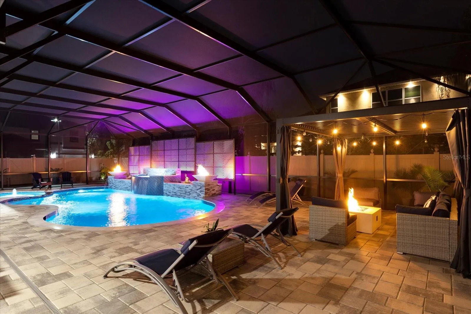 The outdoor area is a true highlight. Enjoy a resort-style saltwater pool upgraded with jets, a hot tub, waterfall, and gas fire bowls. A full screen enclosure with Florida glass and an insulated roof extension makes the space usable year-round. Additional features include an outdoor kitchen with commercial-grade ventilation, pergola (with lighting and a fan), a fire pit, extended paver patio and driveway, and decorative rock columns that enhance curb appeal.