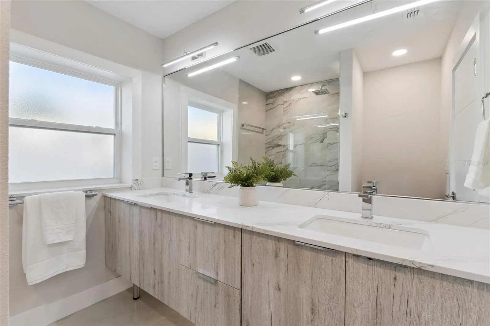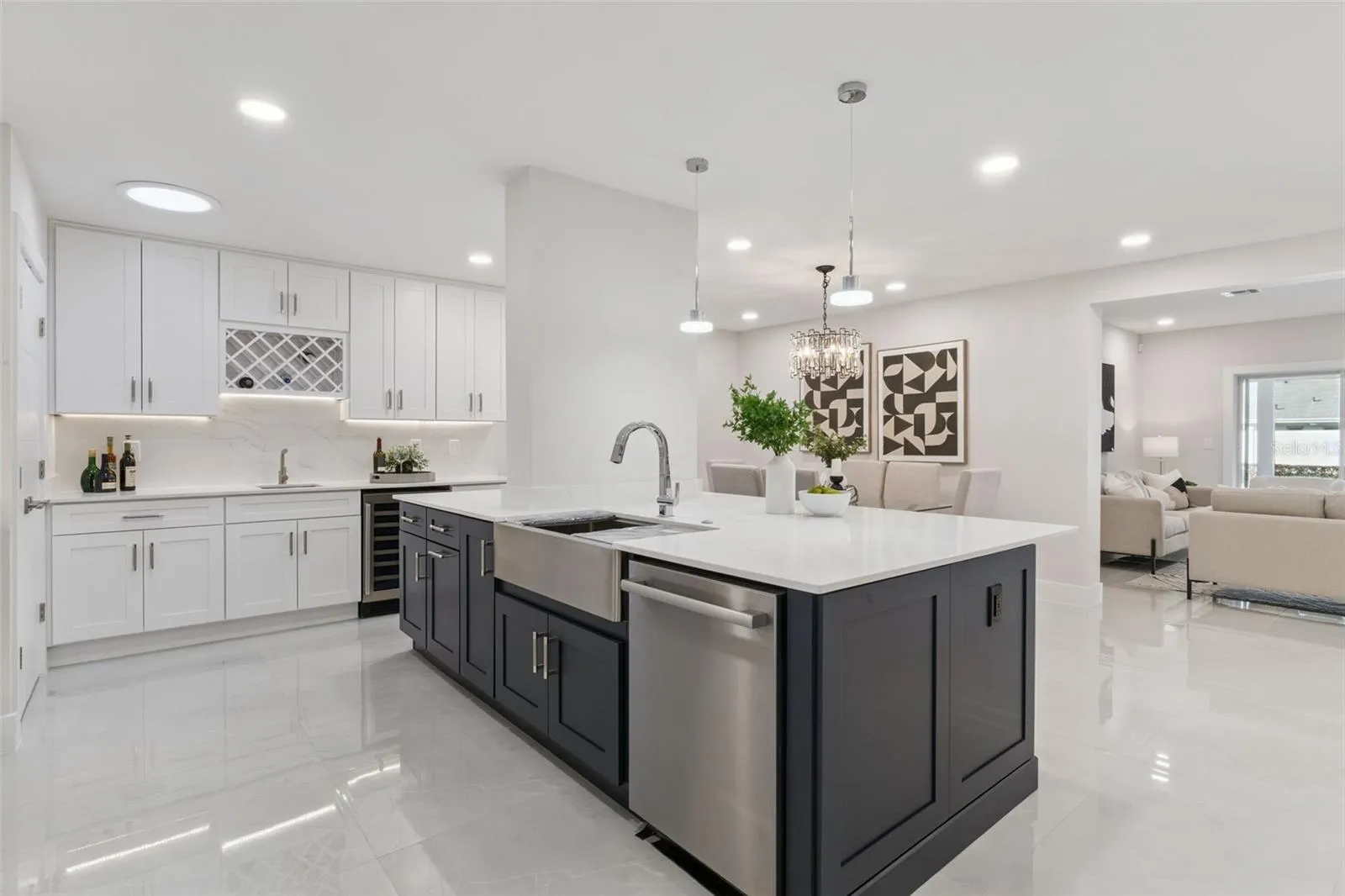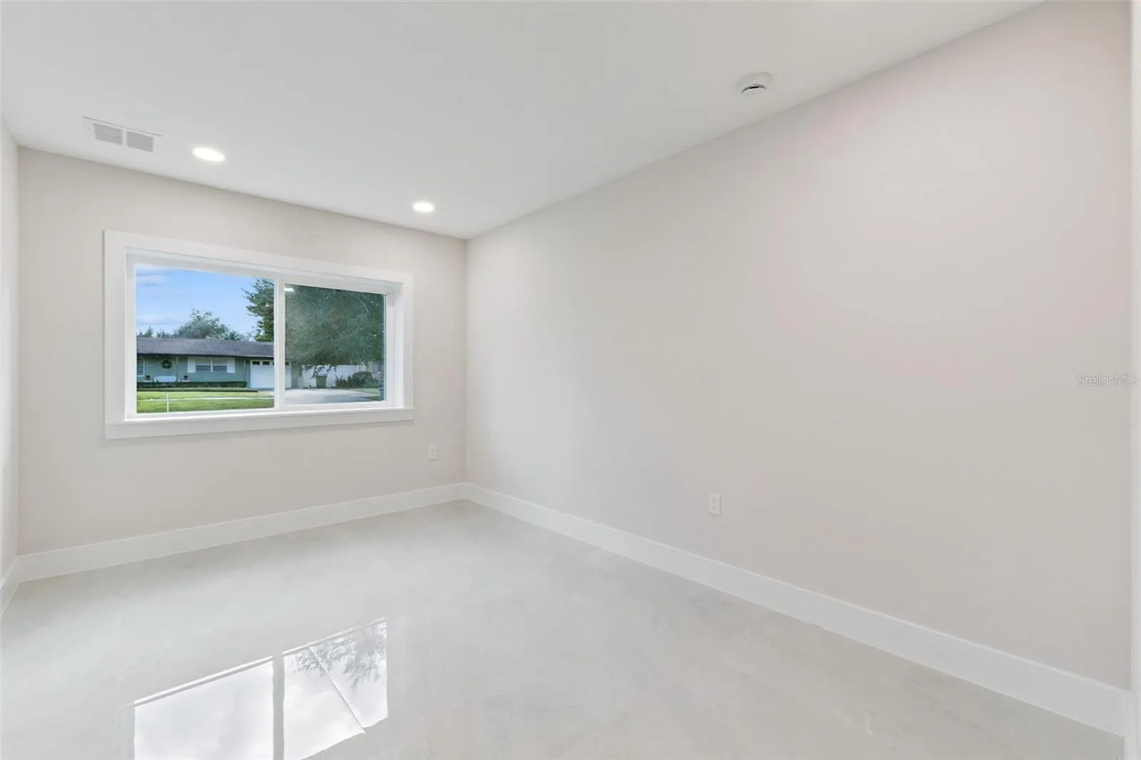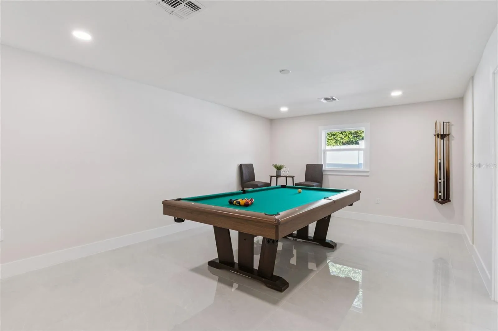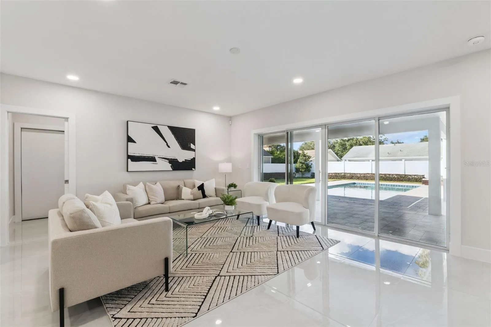 Inside, natural light moves through open living spaces finished with wide porcelain tile floors. The kitchen stands as a sophisticated gathering space with a large quartz island, custom cabinetry, Bosch appliances, and a walk in pantry. The primary suite offers a peaceful retreat with direct access to the pool and a spa inspired bath. A second ensuite bedroom, dedicated office, and generous flex room provide versatility for daily living.