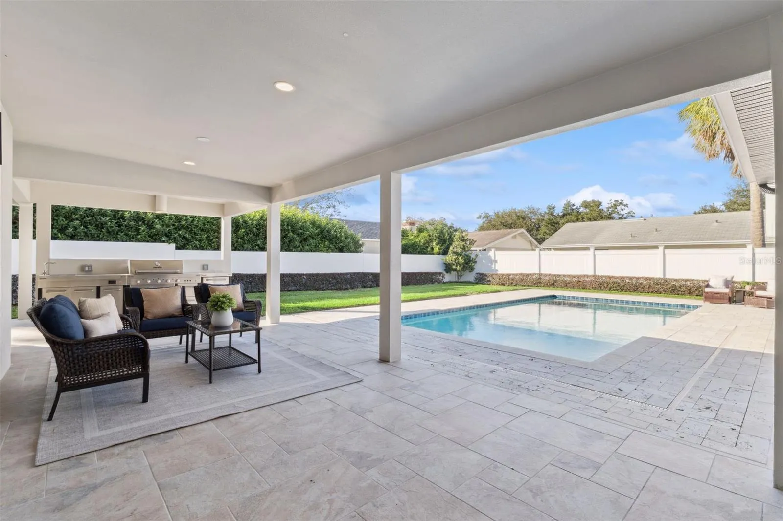 The backyard feels like a private resort with a covered outdoor kitchen and a sparkling pool framed by thoughtful landscaping.