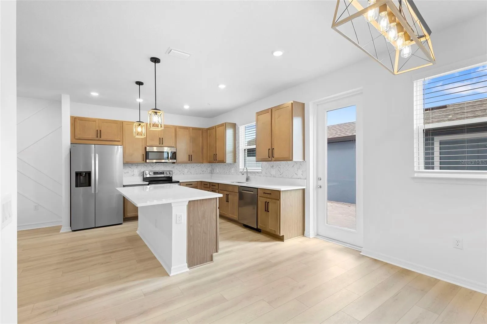Stylish and spacious 3 bed, 2.5 bath townhome available in the highly desirable Eden Crest community in Apopka. This move-in ready, newly built home features luxury vinyl plank flooring throughout the main level, a gourmet kitchen with quartz countertops, 42″ cabinets, and a large center island. The open-concept layout includes a downstairs flex room, perfect for a home office or gym, along with an upstairs bonus loft ideal for a playroom or second living area. Additional upgrades include LED ceiling lights throughout, pendant lighting over the island and dining area, ceiling fans, decorative accent wall detailing, and more. Enjoy a private fenced courtyard, a two-car garage, and a spacious primary suite with a walk-in closet and en-suite bathroom. An ADT alarm system is included for added security and peace of mind. Community amenities include a resort-style pool, cabana, dog park, tot lot, and walking trails. Conveniently located just minutes from SR-429 (Disney), SR-408 (Downtown Orlando), and SR-414. Lawn care is included. This beautiful, designer townhome is brand new and move-in ready, just in time for the holidays!