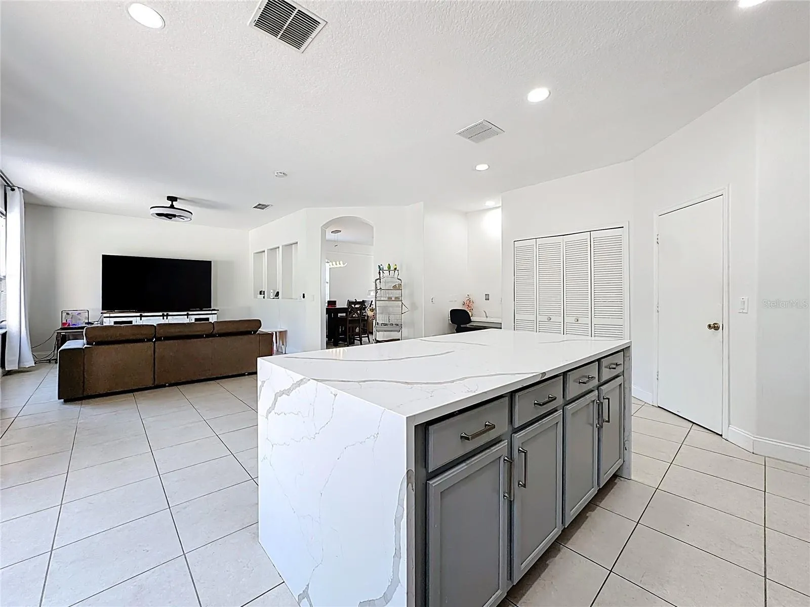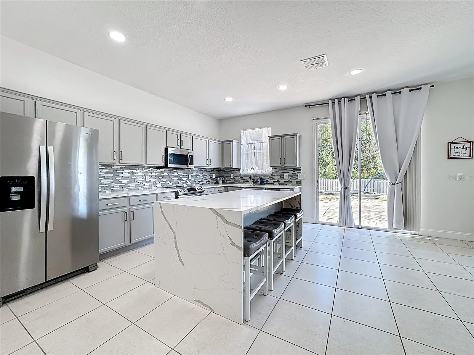 The heart of the home is the stunningly updated kitchen, designed for both cooking and entertaining. It features sleek gray cabinets, beautiful stone countertops, a full suite of stainless steel appliances, and a large center island bar with seating for four. This inviting space opens to the family room, with views of the private, fully-fenced backyard. Backing up to a conservation area, the yard is a serene outdoor escape. A perfect place for pets, barbecues, a play set, or a relaxing garden oasis.