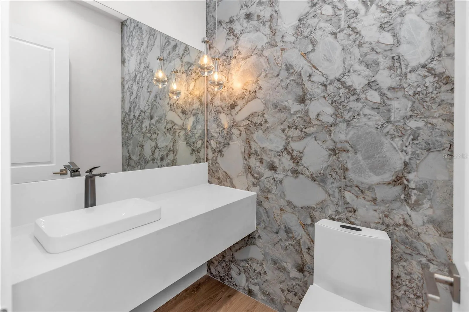 At the heart of the home is a designer kitchen boasting quartz countertops, stainless steel appliances, and a custom LED-lit wine cabinet—perfect for the culinary enthusiast. The seamless flow into the dining and living areas creates an ideal space for entertaining, all while overlooking your private backyard oasis.