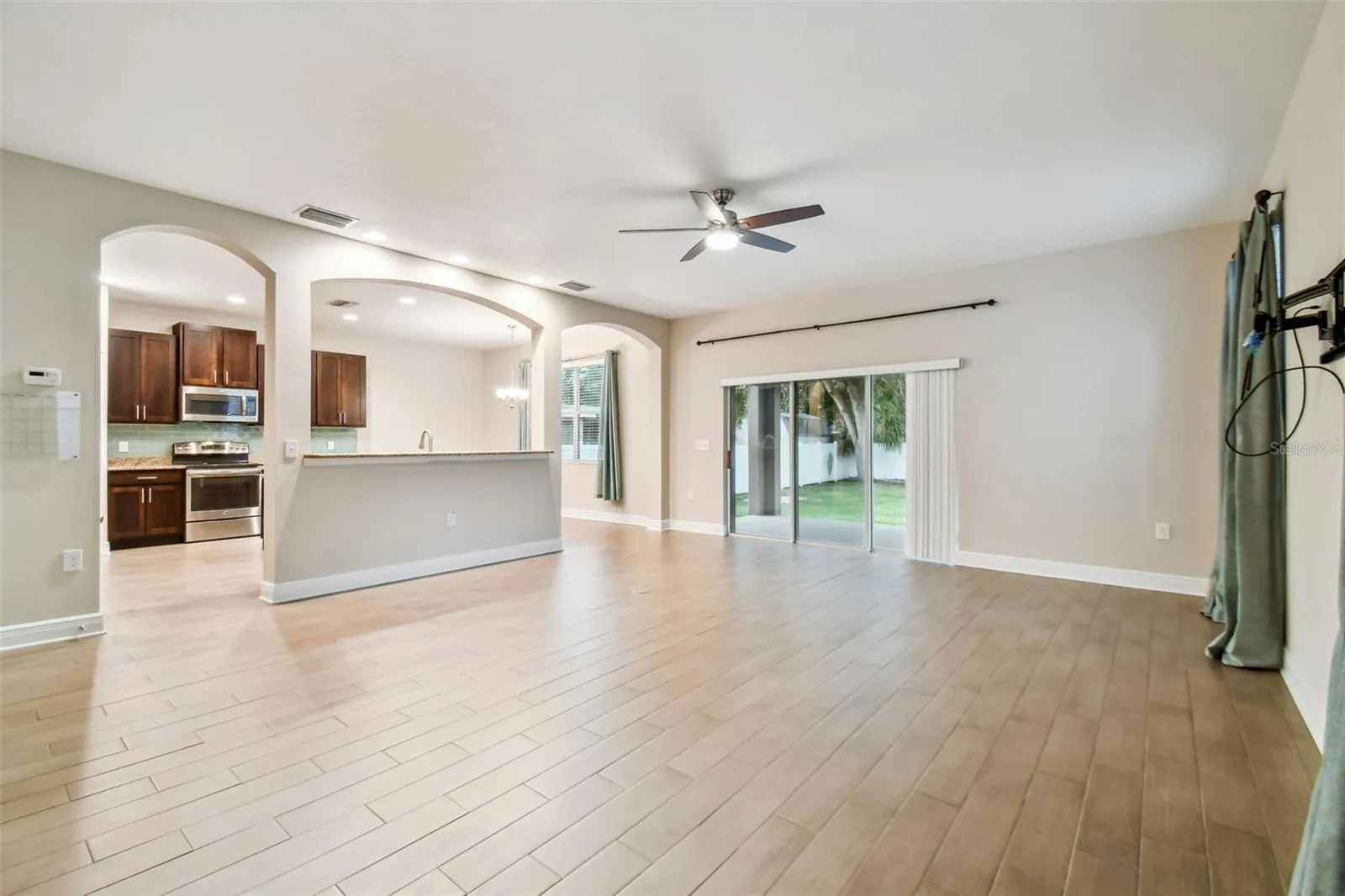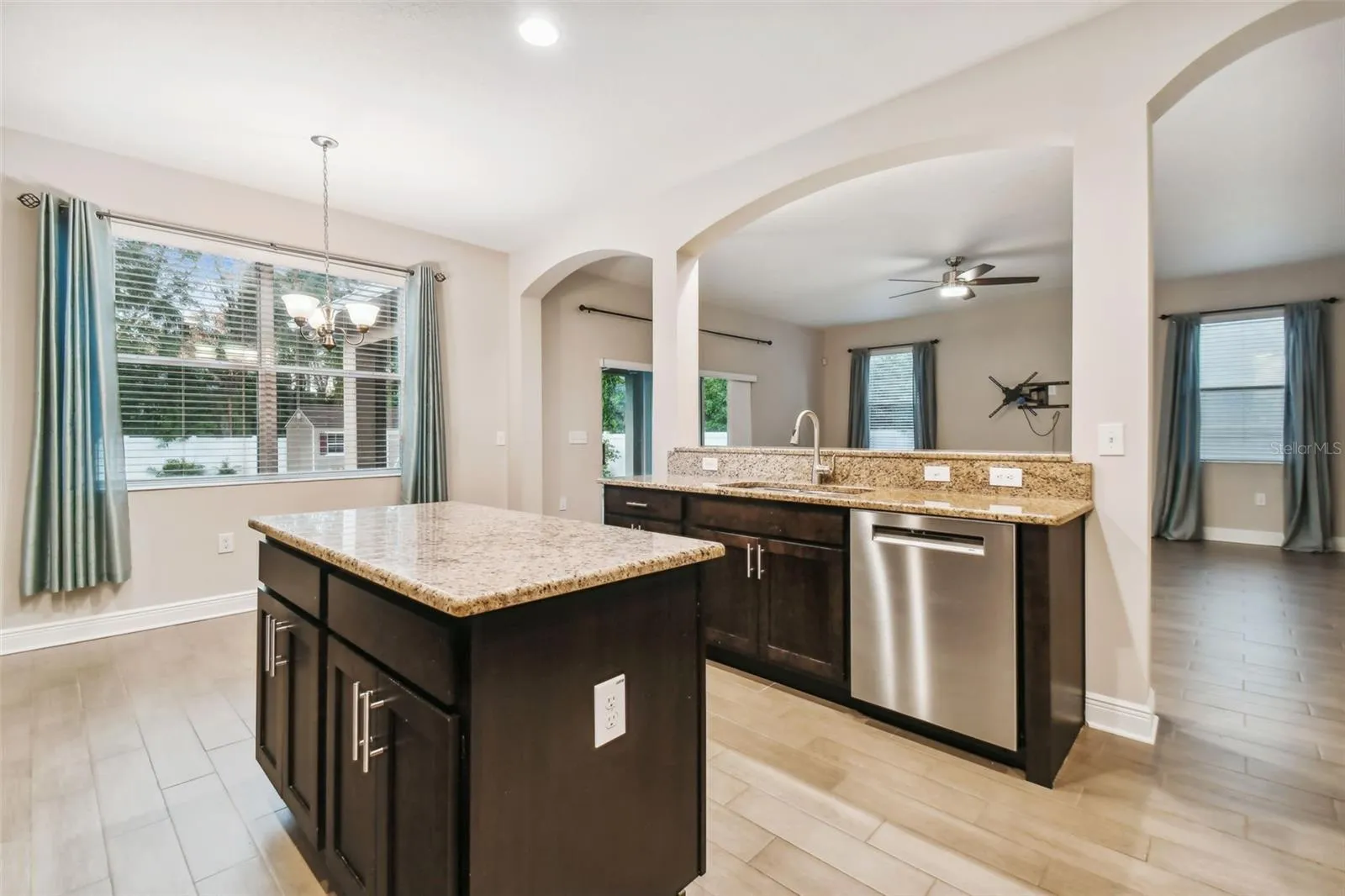 room, with its beautiful wood-looking floors throughout, adjoins the spacious kitchen and dining area. The kitchen is a cook’s dream, with tall cabinets, a breakfast bar, and a