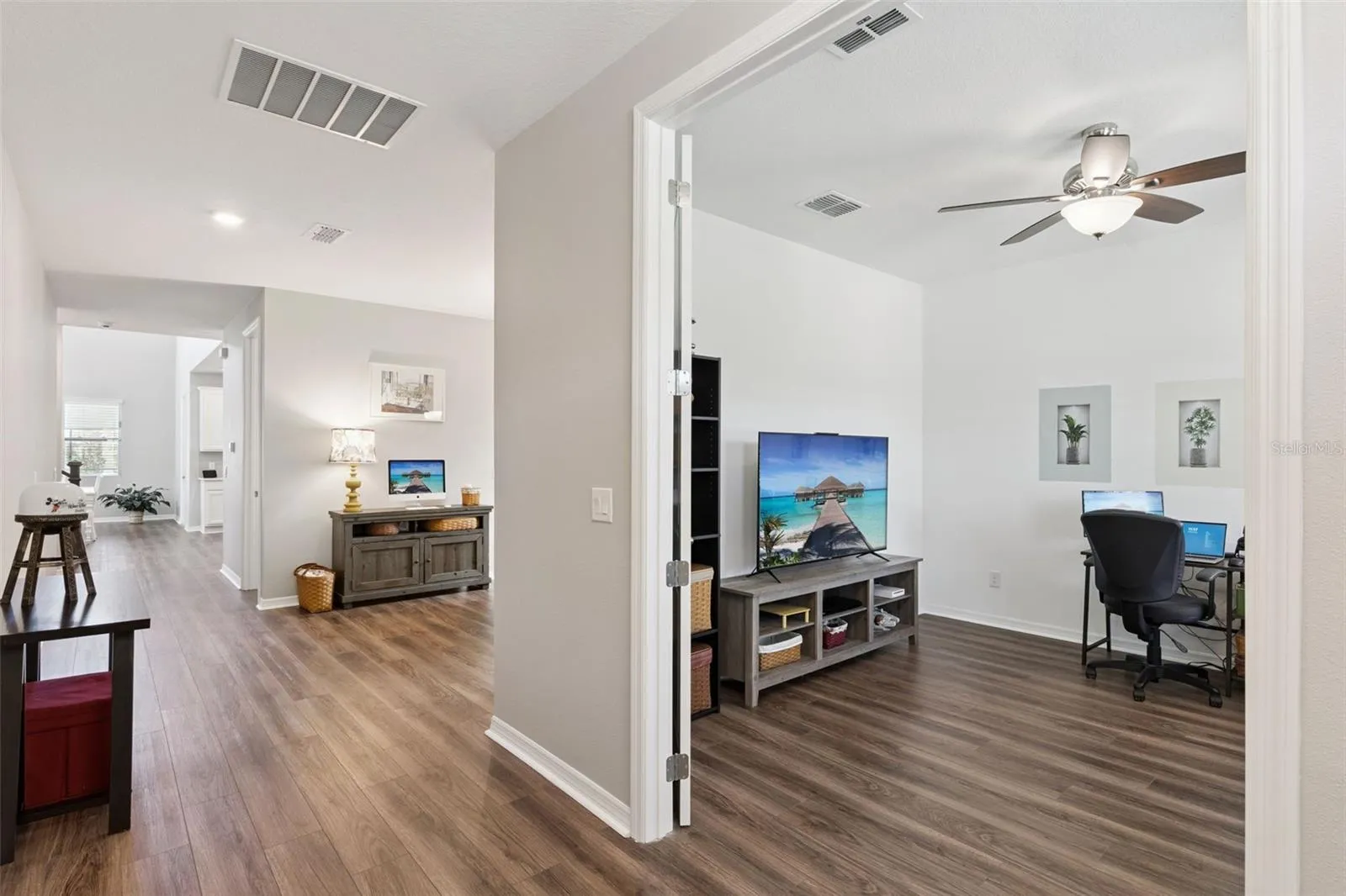 The first floor showcases luxury vinyl plank flooring throughout and includes a dedicated office with French doors, ideal for working from home or enjoying a quiet retreat. The formal dining room offers an inviting space for entertaining, while the gorgeous gourmet kitchen features stunning cabinetry, a designer backsplash, and a large island that opens to the great room with its impressive two-story ceiling and custom wall feature with a beautiful fireplace that adds warmth and character to the space.