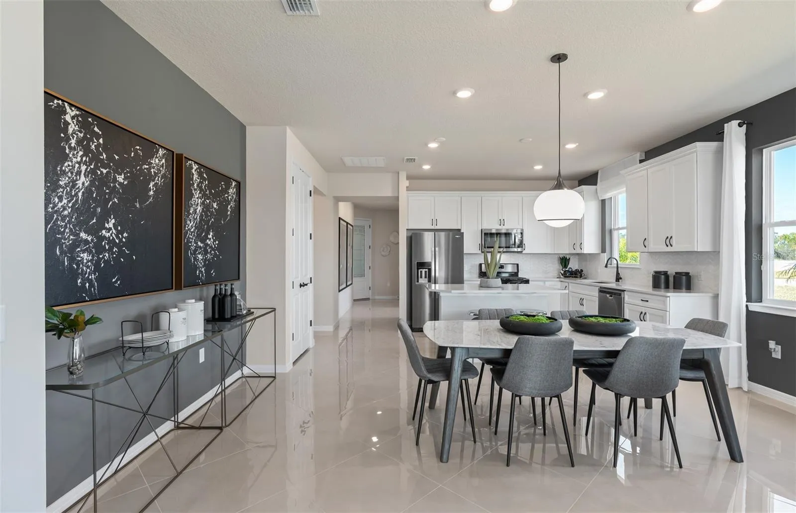 Introducing the exquisite Ellenwood Villa by Del Webb, where luxury meets everyday convenience. This home features 2 bedrooms, an enclosed flex room, and 2 bathrooms in a thoughtfully designed layout that balances style with comfort. The spacious, open-concept kitchen, café, and gathering room are bathed in natural light, creating a warm and inviting space perfect for relaxation or entertaining. High ceilings, ample windows, and a sliding glass door that leads to the covered lanai help blend indoor and outdoor living seamlessly. The kitchen stands as a true highlight, offering both beauty and functionality. It boasts stainless steel Whirlpool appliances – including a refrigerator, elegant 42” Dana White soft-close cabinets, Lagoon Quartz countertops, an upgraded faucet, and a sleek stainless-steel single-bowl sink. Whether you’re preparing a meal or hosting guests, this kitchen is designed for ease and elegance. Retreat to the owner’s suite, tucked at the back of the home for privacy. This serene space features a spa-like en suite bathroom with a frameless glass-enclosed shower, a private toilet area, a dual vanity with quartz countertops, and a linen closet—creating a peaceful environment for unwinding. The secluded secondary bedroom and bathroom offer even more privacy, providing a perfect retreat when you need it most. The enclosed front flex room adds versatility to the home, ideal for a home office, hobby space, or any personal retreat. Designer finishes are throughout, with thoughtful touches such as pendant pre-wiring, 2” faux wood blinds, 8’ interior doors, Whirlpool washer and dryer, comfort-height toilets, and Shaw brand luxury vinyl plank flooring. Tile flooring graces the bathrooms and laundry room, enhancing the overall aesthetic. For the modern homeowner, this home is equipped with smart technology, including a smart thermostat, smart doorbell, and LED downlights ensuring your home is as connected as it is stylish. With its blend of luxury, functionality, and cutting-edge features, the Ellenwood Villa offers an exceptional living experience. Don’t miss the opportunity to make it yours.