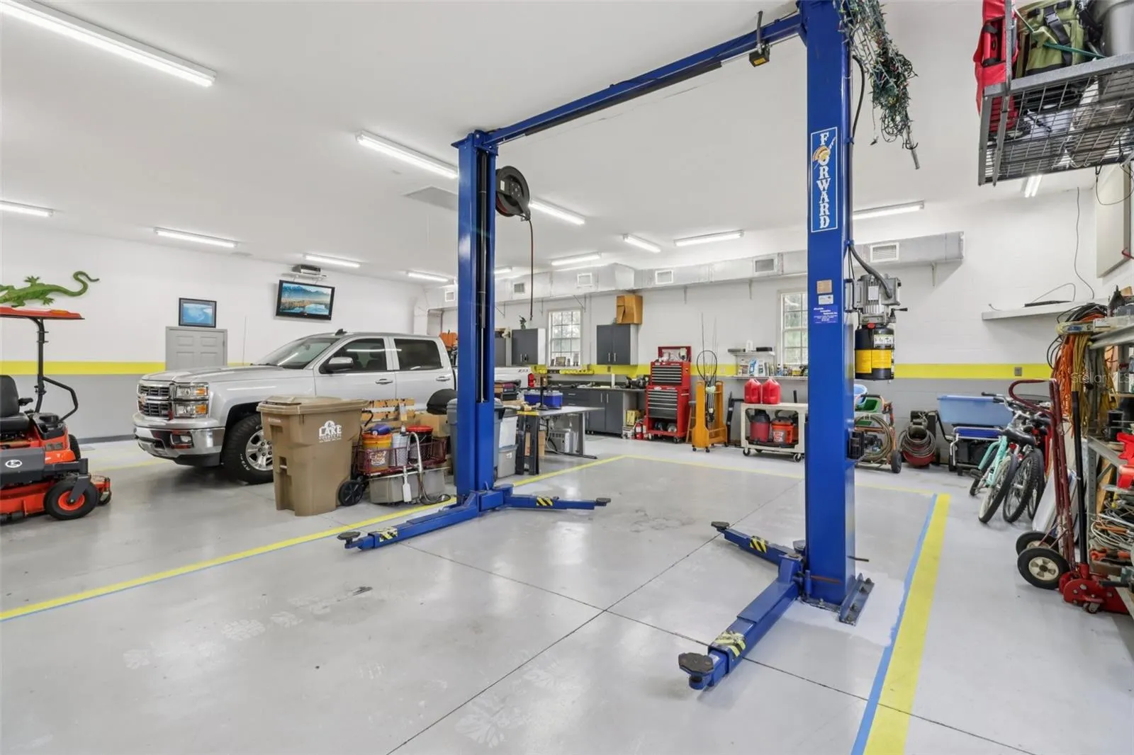 1/1 BONUS SUITE in the DETACHED”CLASSIC CAR BUILDING”. New Roof 2018′ -Double Front Doors welcome you into this amazing living area with split floorplan showcasing porcelain tile floors throughout. The updated kitchen has a spacious walk-in pantry and is open to the living/dining area and overlooks the lanai, firepit, and pool, making this the perfect gathering place for family and friends. The amazing quarts countertops and backsplash complement the solid wood cabinets with drawer storage, walk in pantry, stainless steel appliances and recessed lighting. (microwave, range & frig in utility room do not convey) The warmth of light “wood look” porcelain floor tile throughout this home adds to the natural light and invites all to enjoy the space. Kitchen floor being replaced with the matching porcelain tile in living areas prior to closing. The split floorplan offers privacy as well as functionality for family or guests. The beautiful primary suite has a large ensuite bath, walk in shower, his and her closets, quartz counters with dual vessel sinks and extra countertop decorator cabinets for additional storage. Conveniently located, the large utility room includes utility closet with utility sink, and extra cabinets extra storage with outside entrance for lanai for easy access. Enjoy the sunsets and just relax in the paver deck area around your SCREENED POOL and HEATED SPA with Fire Pit and Country Kitchen/BBQ space. Can’t forget to mention the landscaped Pergola walkway out to the drive and entrance to garage. Green thumb? No problem, this home also includes your own greenhouse just waiting for your touches. This beautifully designed and meticulously maintained landscaped property affords many opportunities. The 2.22 acres are fully fenced and include the electronically operated iron security gate. GOT HORSES? Plenty of room for pastures and an additional barn or building. The” CLASSIC CAR BUILDING” includes the BONUS SUITE with separate living area, full bath, and bedroom with luxury plank vinyl flooring PLUS the “Car Guys Dream Garage” with Electric Car Lift, Air Compressor with Outside Tank, Led Shop Lights and Storage Cabinets.