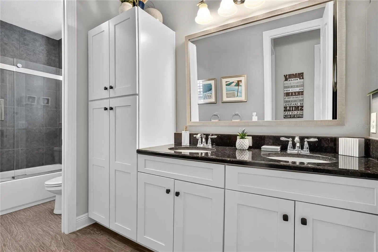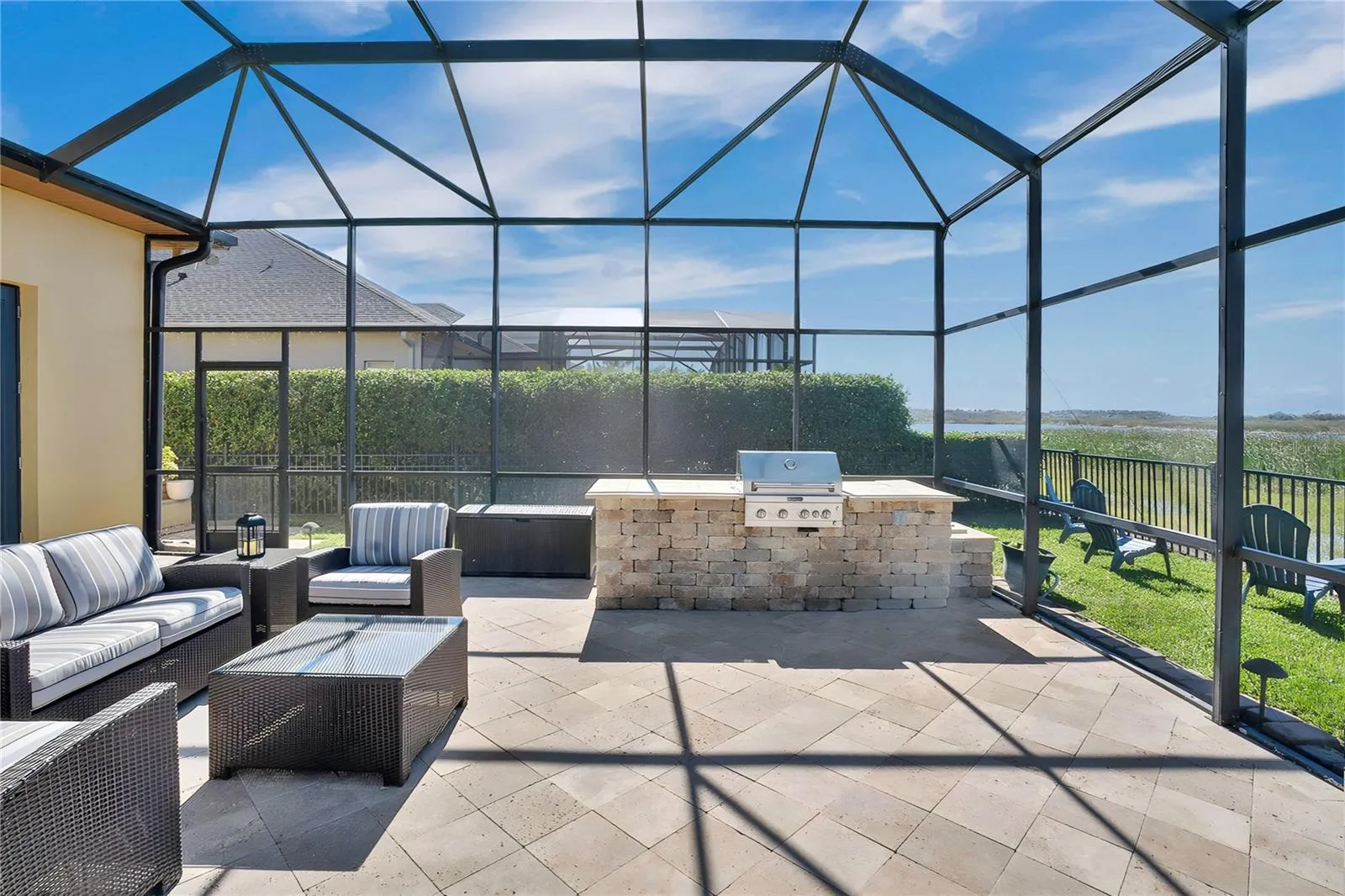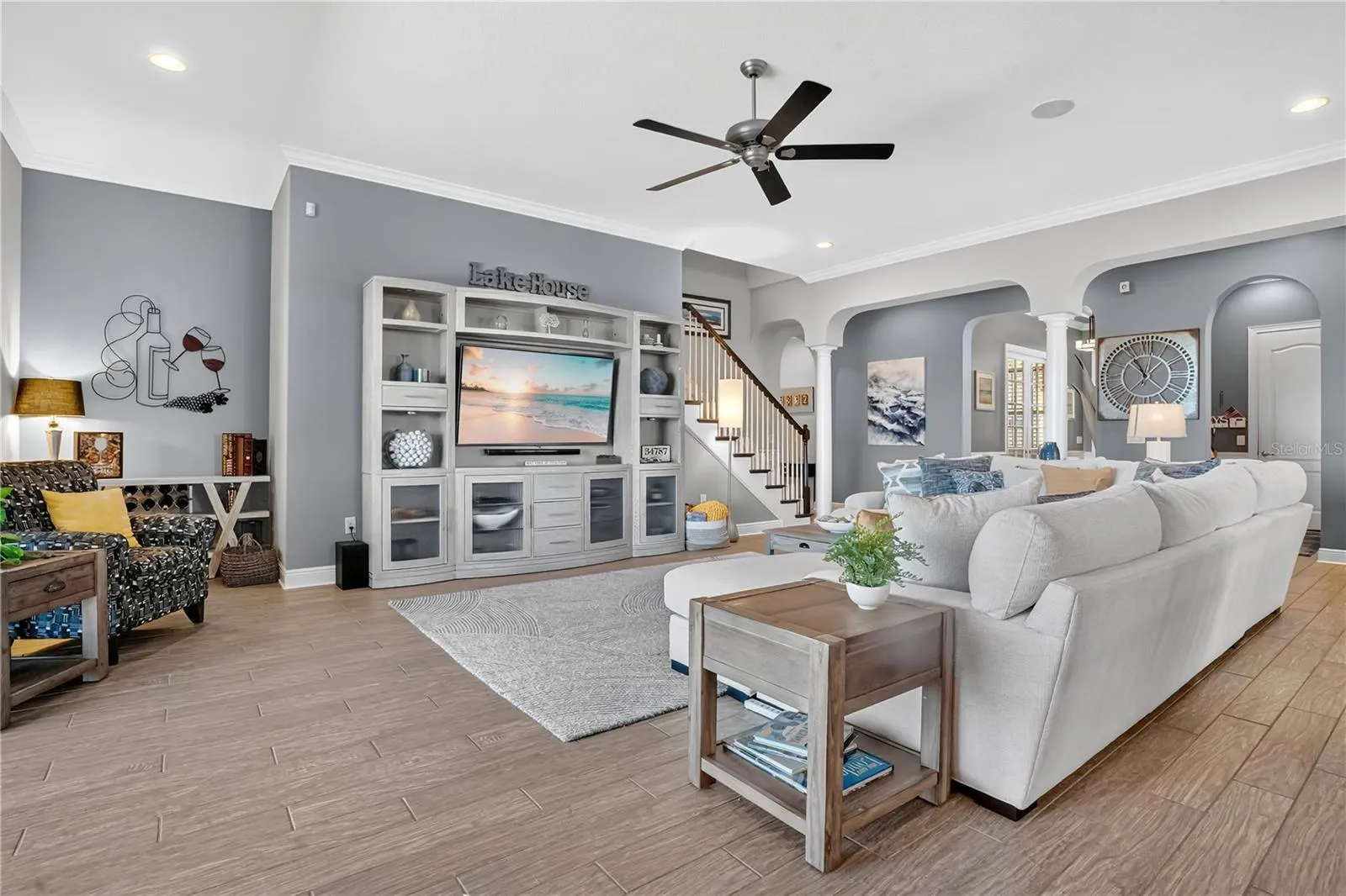 Spectacular Lakefront Living on Johns Lake in Winter Garden, Florida – Pool, Spa & Stunning Sunset Views – Welcome to this extraordinary Standard Pacific executive home, perfectly positioned on over a quarter acre with 87 feet of pristine lakefront along beautiful Johns Lake. From the instant you walk in, the openness, elegance, and sweeping lake view reveal that this is a home unlike any other. Providing more than 4,000 square feet of elegant one-story living with a dedicated upstairs bonus room, this residence offers 4 bedrooms, 4½ baths, and a 3-car garage. This exceptional floor plan reflects the builder’s distinguished craftsmanship and masterfully planned design, elevating the home’s overall sophistication. The home opens into an expansive main living area showcasing triple pocket sliding glass doors that frame the breathtaking views. This space transitions effortlessly into the formal dining room, where crown molding and wainscoting create a refined, elevated ambiance. At the heart of the home lies the gourmet kitchen, beautifully appointed with an expansive granite island accented by a foot rail, premium JennAir appliances including double ovens, an induction cooktop, dishwasher, and microwave, as well as a butler’s pantry with additional cabinetry and a spacious custom-built walk-in pantry. The adjoining dinette overlooks the lake and opens to the outdoor living area through sliding glass doors, creating a perfect balance between indoor comfort and outdoor beauty. A private office/flex space with glass pocket doors offers versatility, while the triple split-bedroom layout ensures privacy for family and invited guests. The primary suite serves as a sophisticated sanctuary, complete with crown molding, custom built-in closets, and a spa-inspired bath. From your bed, enjoy uninterrupted, awe-inspiring views of Johns Lake as you begin each day. Upstairs, a beautifully scaled bonus room with a half bath leads to a balcony with a view that is the unrivaled highlight of the home. This rare, sought-after vantage point delivers stunning, unobstructed lakefront views, perfect for sunset gatherings or quiet moments taking in the scenery. Just beyond the main living areas, you’ll find what truly sets this home apart; the resort-style outdoor oasis. The heated saltwater pool and spa are the centerpiece of an impressive, screened lanai surrounded by an elegant travertine deck, outdoor grill, and multiple seating areas designed for both relaxing and entertaining. With no rear neighbors and unobstructed lake views, the backyard offers unmatched tranquility and the ultimate Florida lifestyle. Additional features include plantation shutters on every window, wood-plank tile flooring throughout, designer-grade fans, automated blinds, a well-appointed mudroom off the 3-car garage, a laundry room with a sink and custom cabinetry, and integrated audio system for an elevated living experience. Located on a quiet cul-de-sac, residents enjoy resort-style amenities including a clubhouse, pool, gym, center, pickleball/tennis courts, playground, and a lakefront walking path. Just 3 miles from Historic Downtown Winter Garden and Winter Garden Village, and within walking distance of top-rated schools, this home also offers easy access to major highways. Only 15 miles from Orlando’s attractions and 25 miles from the airport, the location is exceptional. Don’t miss this Johns Lake estate, where luxury and lakefront views come together in perfect harmony.