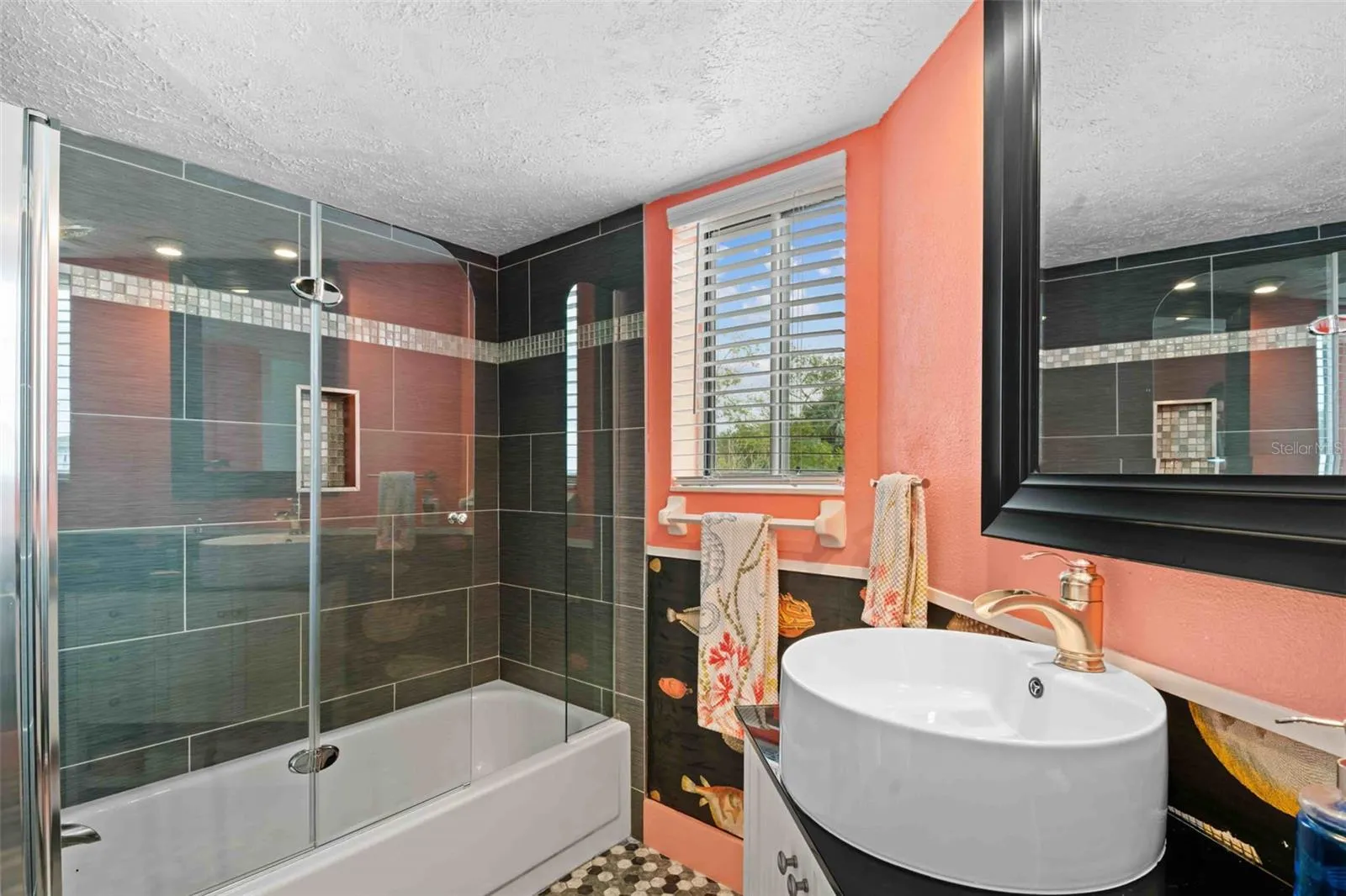 A charming spiral staircase leads to the third level, home to the private primary suite—and the most breathtaking views in the home. Perched high above the surrounding landscape, this level offers panoramic views of the untouched Preserve, shimmering Gulf waters, and sweeping sunsets that light up the horizon. Whether you’re waking up to tranquil morning light or unwinding at dusk, the scenery from this top floor is nothing short of spectacular. The suite also includes a generous walk-in closet with custom shelving and a beautifully appointed ensuite bathroom complete with a custom vanity and a walk-in shower with a glass door and niche.