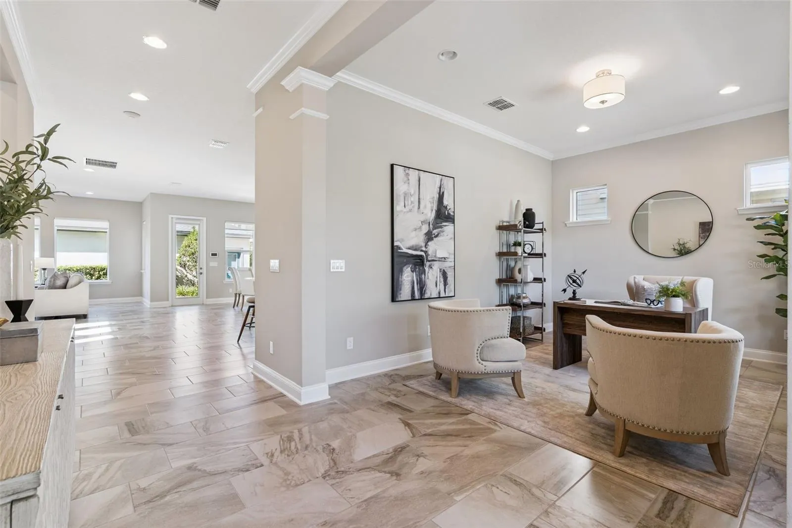 One or more photo(s) has been virtually staged. *** Spacious Lake Nona Retreat **Beautiful and rarely available, this David Weekley Homes Wharf floor plan offers four bedrooms, three full baths and 3,244 square feet of light filled living space in the heart of Lake Nona’s Laureate Park in Orlando. Curb appeal shines with stone wrapped columns, a deep covered front porch and a statement teal front door that sets the tone for the rest of the home. Inside, a welcoming foyer opens to a large private office at the front of the home and flows into an expansive open concept kitchen, dining area and living room, all wrapped in windows for an airy, connected feel. The gourmet kitchen features an oversized island with seating, stainless steel appliances, abundant cabinetry, a walk in pantry and long stretches of counter space that are perfect for entertaining. The thoughtful layout includes a first floor bedroom with a generous closet and an adjacent full bath with a step in tiled shower, an ideal setup for aging parents, long term guests or a quiet retreat. Upstairs, the floor plan centers around a spacious loft that works beautifully as a second living room, media room or play space. The serene primary suite spans the back of the home and features a tray ceiling, large walk in closet space and a spa inspired bath with an oversized shower, separate vanities and excellent storage. Two additional bedrooms share a well appointed full bath with granite counters and stylish tile, and the upstairs laundry room is conveniently located near all three bedrooms. Out back, a detached three car garage frames a cozy yard with plenty of room to design your dream outdoor living area. We have even taken the liberty of creating a backyard design inspiration to showcase how this space can become a beautiful courtyard style retreat. This four bedroom Lake Nona home with loft and three car garage combines luxury, function and location, just minutes from Lake Nona Town Center, Medical City, restaurants and parks.