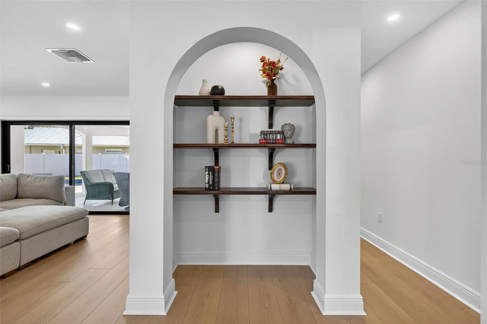 As you step inside, you’re greeted by a breathtaking open-concept design centered around a custom architectural arch that instantly sets the tone for the home’s timeless elegance. The kitchen showcases a Perla Venata quartzite waterfall island and countertops, paired with full custom cabinetry in rich walnut and shittake tones for a warm, modern Mediterranean feel.