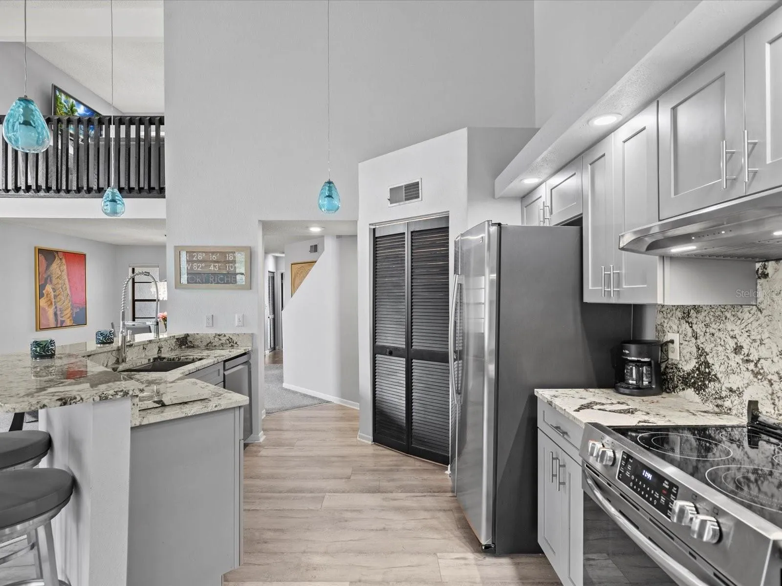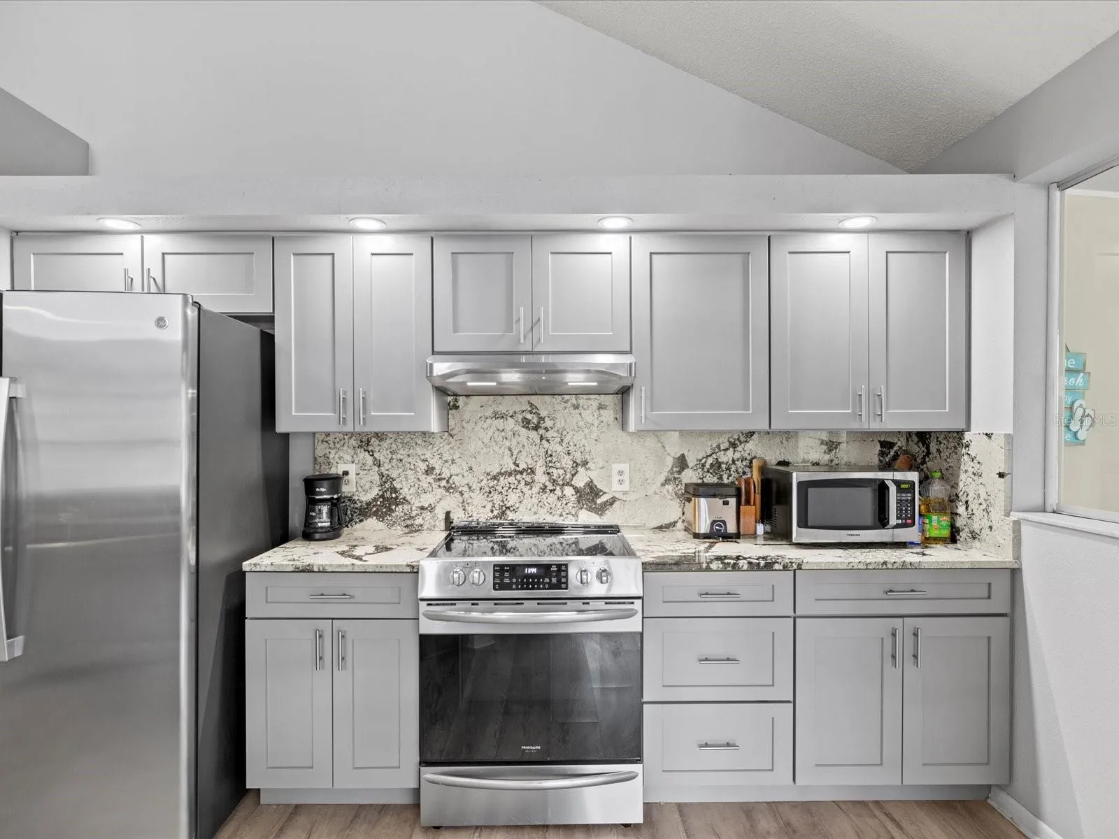 The airy living space flows seamlessly into the completely remodeled kitchen, which boasts updated, maple stained grey cabinets, high level granite countertops, a modern pull-down faucet, and a stylish backsplash. All kitchen appliances are stainless steel featuring convection oven with air fryer. A convenient breakfast bar overlooks the living room, and a pass-through window connects to the family/sunroom. The laundry closet is conveniently located off the kitchen.