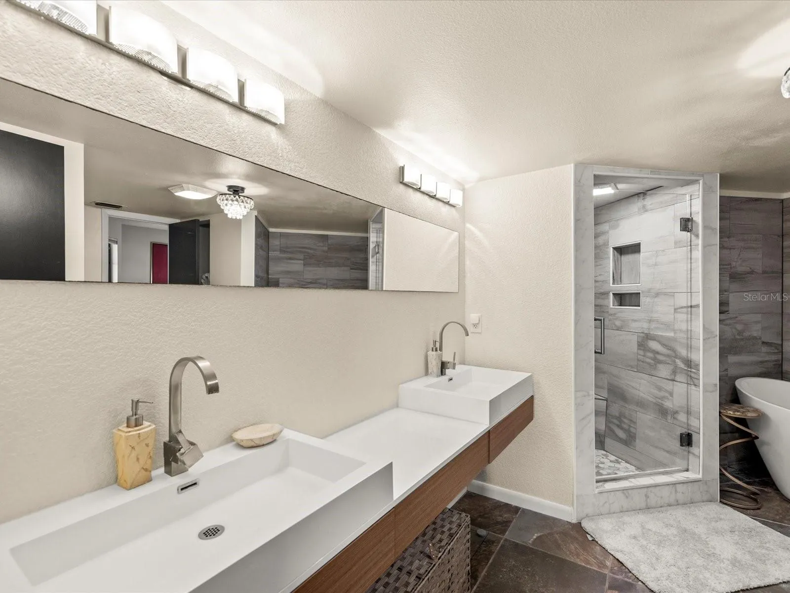 The first-floor en suite primary bedroom includes new carpeting and a beautifully updated bathroom featuring dual floating sinks, a luxurious soaking tub, a separate tiled shower stall, new toilets, and modern fixtures. Upstairs, is a loft and sitting area with premium hardwood floors. This space provides additional storage. Off the loft is a second bedroom and full bathroom—ideal for guests or family.