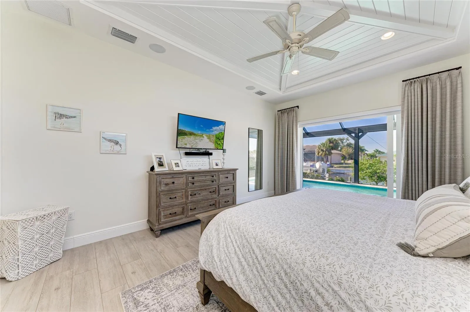 Showcasing timeless West Indies architectural influence, this residence features Bahama shutters, cypress corbels, hand-lathed lap siding, an expanded paver driveway, and lush new landscaping. Inside, enjoy soaring 12’–14′ ceilings and abundant natural light highlighting panoramic water views through zero-corner sliders.