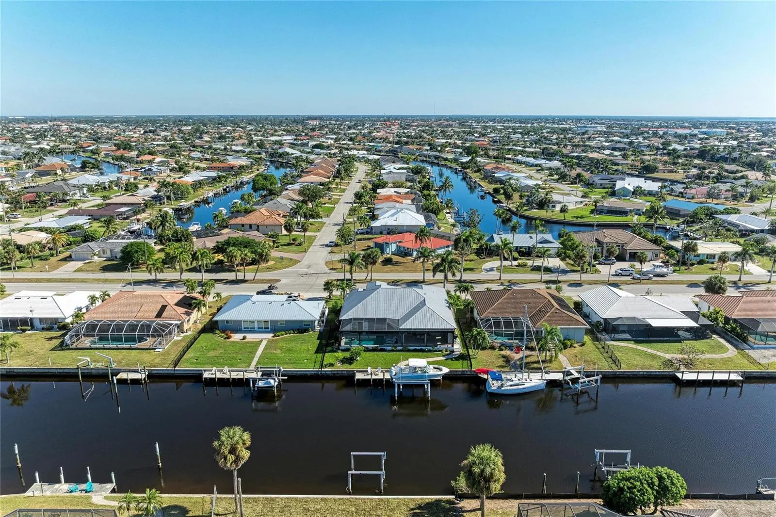 Welcome to this bespoke 3-bedroom + den, 3-bathroom, 3-car garage waterfront masterpiece with pool, spa, and 27,000 lb. boat lift. Built in 2017 and perfectly situated in the sought-after “Old Sailboat Section,” this home offers quick, direct access, less than 5 minutes, to Charlotte Harbor and a short ride to the Gulf, Boca Grande, and many waterfront dining destinations. You’re also just a short walk, bike ride, or golf cart trip to historic downtown Punta Gorda and Fishermen’s Village.